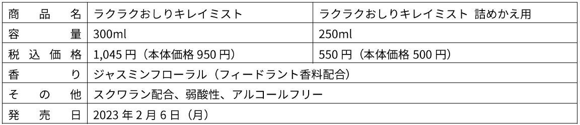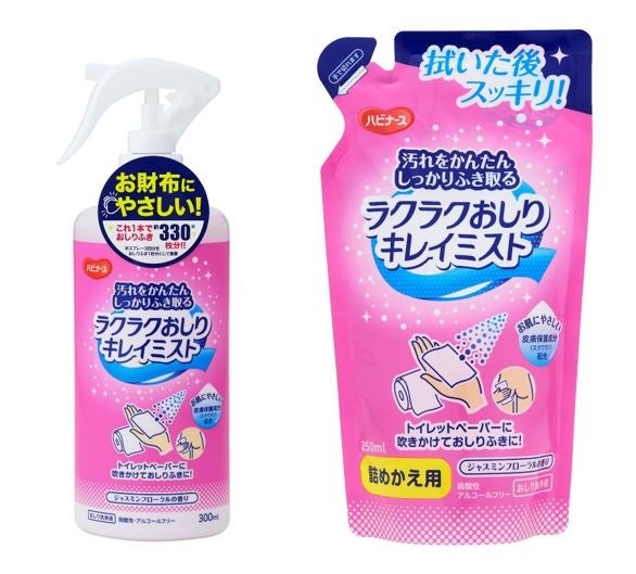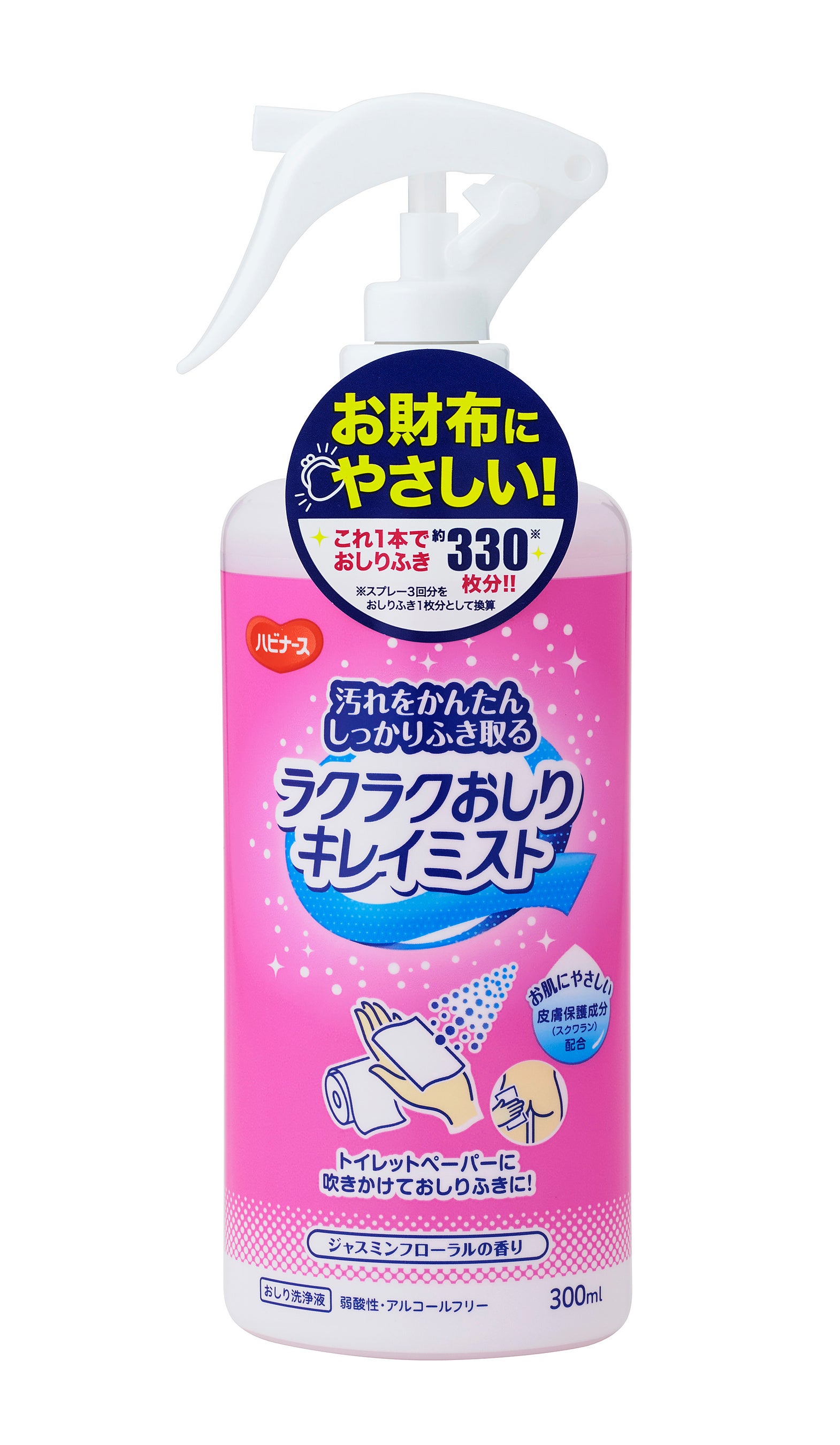 今回発売する「ラクラクおしりキレイミスト」は、介護用品では新しい、トイレットペーパーに吹きかけるだけで流せるおしりふきに変えることができるスプレーです。3つの洗浄成分と皮膚保護成分を配合しており、肌への負担を軽減しつつ汚れをしっかりと落とすことができます。そのうえ、本体ボトル1本でおしりふき約330枚分※3に相当するため経済的にご使用いただけます。さらに、水解性の高いトイレットペーパーをそのまま活用するため、トイレに詰まりにくく環境にやさしい商品です。