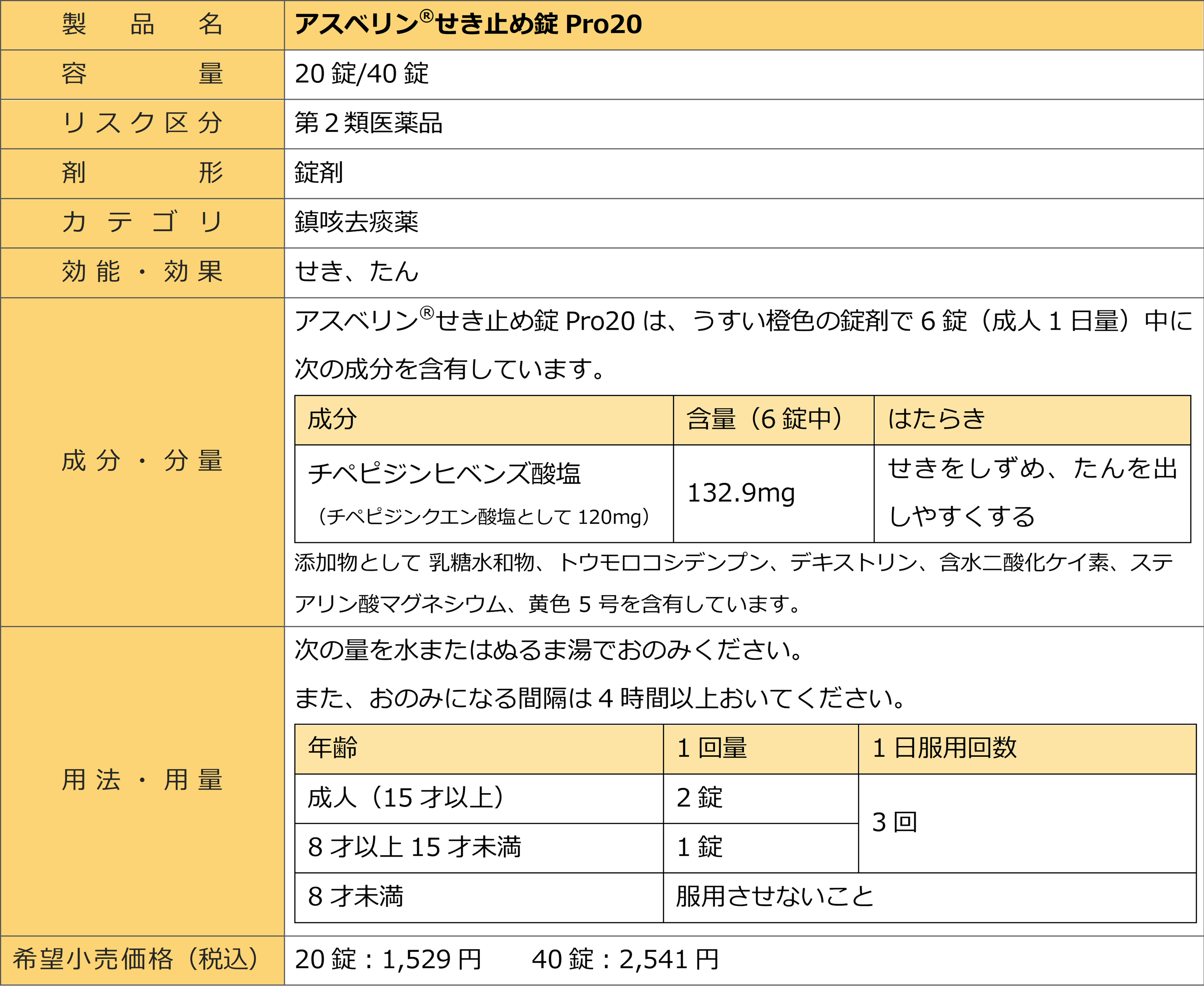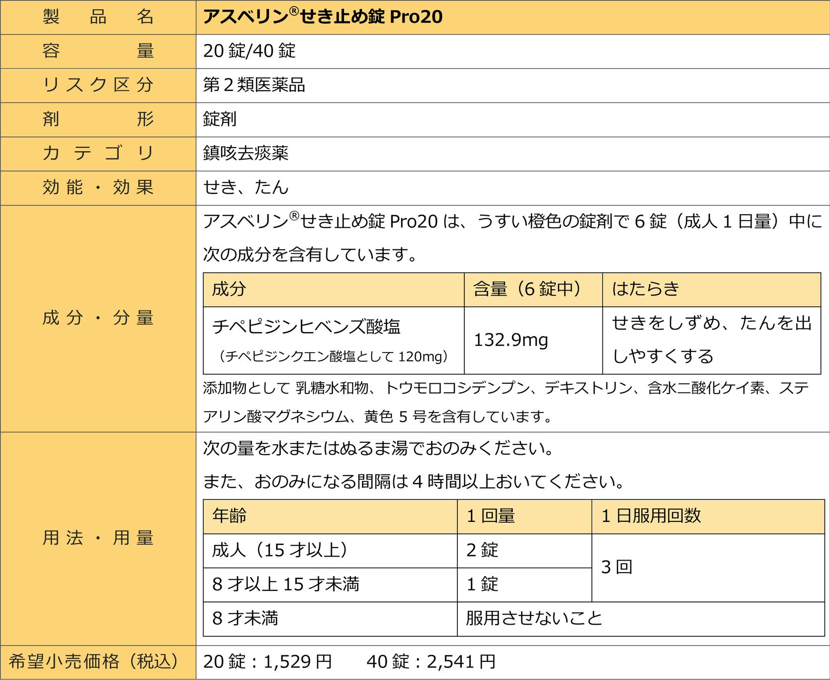 こうした市場環境と生活者ニーズを踏まえ、当社は、医療用と同成分を同量配合*2した「アスベリン®せき止め錠Pro20」を発売する運びとなりました。本製品は26年5月施行予定の指定濫用防止医薬品に該当しない非麻薬性成分のせき止め薬です。