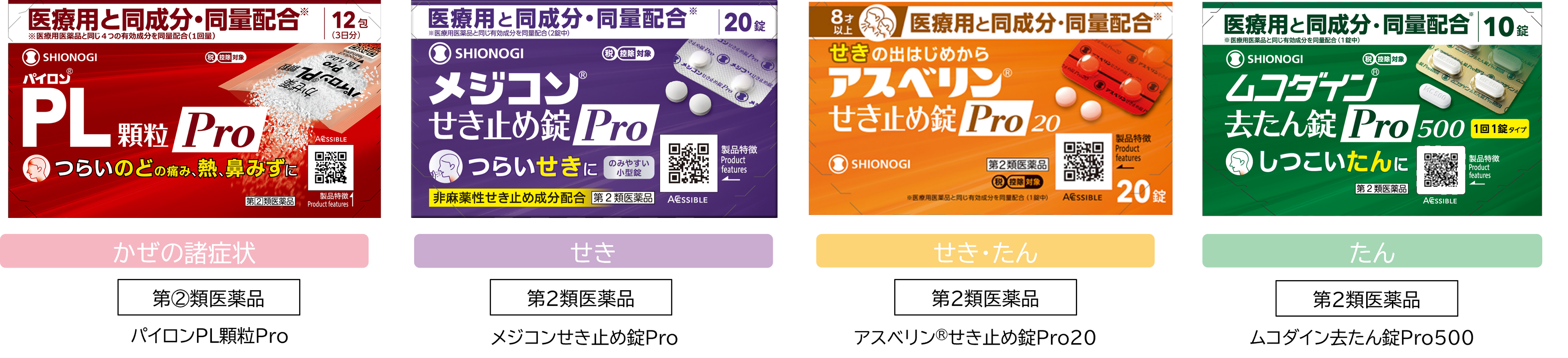 *1 シオノギヘルスケアの Pro シリーズ:かぜ症状ブランド(パイロン PLシリーズ、メジコン、ムコダイン)の Pro シリーズのこと (パイロン ®PL 顆粒 Pro、パイロン ®PL 錠 Pro、メジコン®せき止め錠 Pro、メジコン®せき止め液Pro、ムコダイン®去痰錠Pro500)