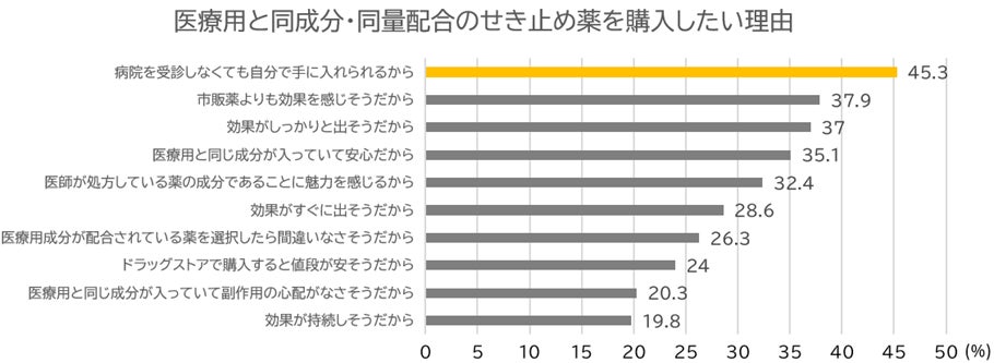 一方、鎮咳去痰薬市場では、26年5月施行予定の指定濫用防止医薬品に該当する製品も数多く、安全性や規制区分を意識する生活者も見られます。当社調査では、医療用と同成分・同量配合のせき止め薬について「利用したい」と回答した人が約69%にのぼり、その理由として「病院を受診しなくても自分で入手できるから」(約45.3%)が最も多い結果となりました。こうした背景から、自宅で適切に対処できる選択肢へのニーズが確認されています。
