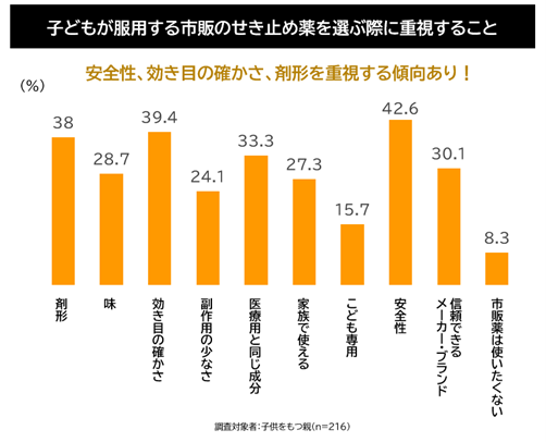 また、医療用医薬品「アスベリン®」では小児への処方割合が高いことが示されており、子どもを持つ保護者を対象とした当社調査でも、市販のせき止め薬を選ぶ際には「安全性」「効き目の確かさ」「剤形」が重視される傾向が明らかになりました。