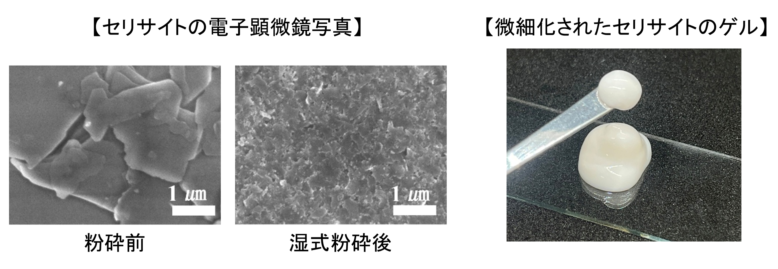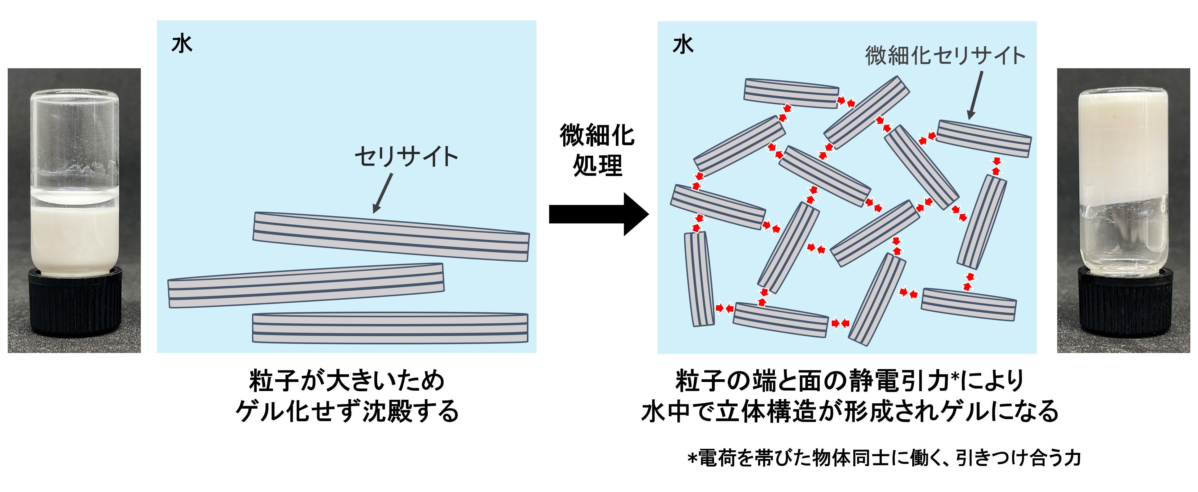 セリサイトは、層間の結合が非常に強固な非膨潤性粘土鉱物であるため、通常は水を加えてもゲルを形成しません。しかし今回、セリサイトを湿式粉砕により微細化し、平均粒子径1μm以下の微粒子にすることで、水中でゲルを形成することを発見しました。