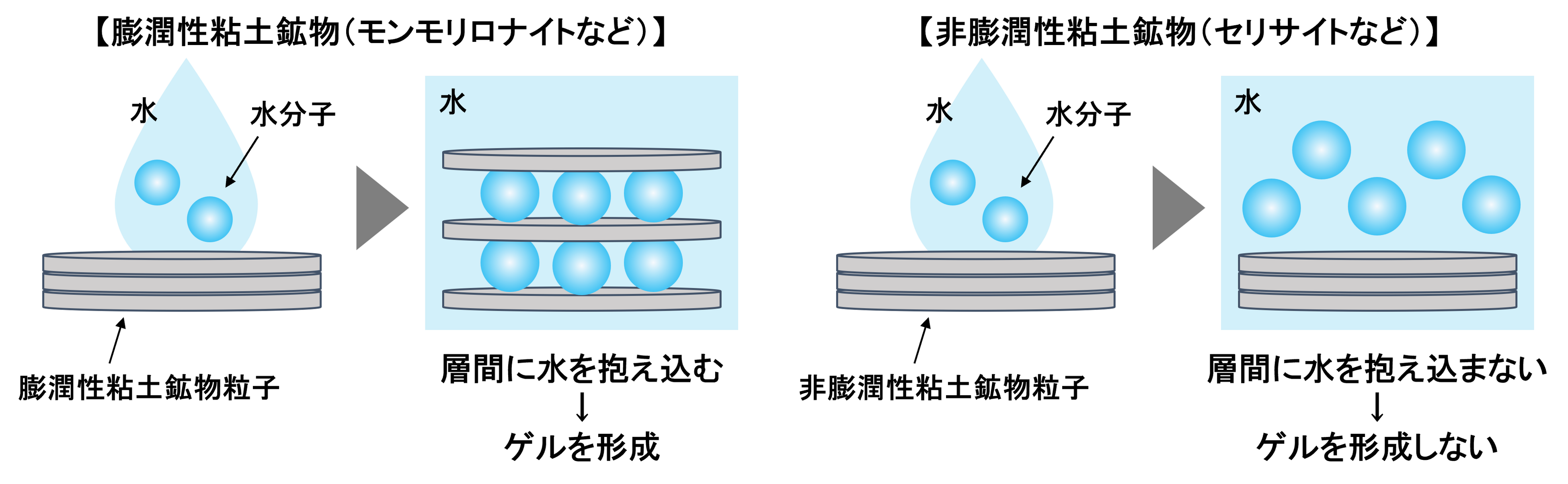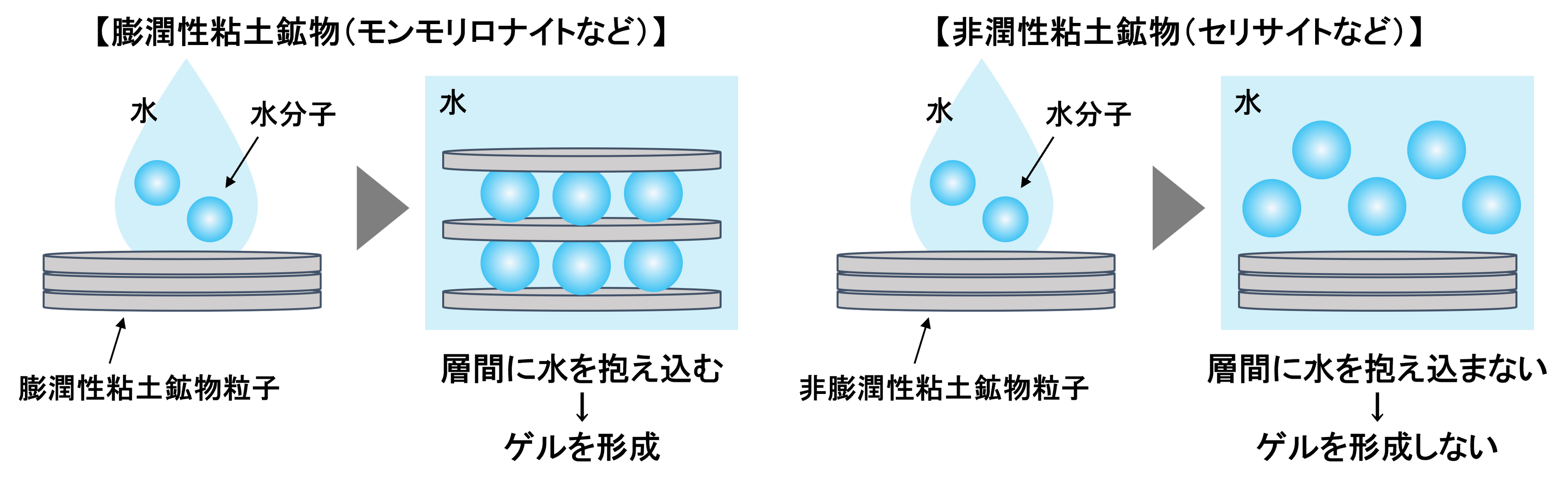 粘土鉱物は、その層状構造の重なり方や結合の強さによって性質が異なり、水を吸収して膨らむ「膨潤性粘土鉱物」(例:モンモリロナイト)と、水が層間に入り込まない「非膨潤性粘土鉱物」(例:セリサイト、カオリナイト)に分類されます。これまでゲル化剤として主に使われてきたのは、吸水性や吸着性に優れた膨潤性粘土鉱物です。しかし、粘土鉱物を用いたゲルは、使用感に“重さ”や“のびの悪さ”を感じさせることが多く、使い心地の面で課題がありました。