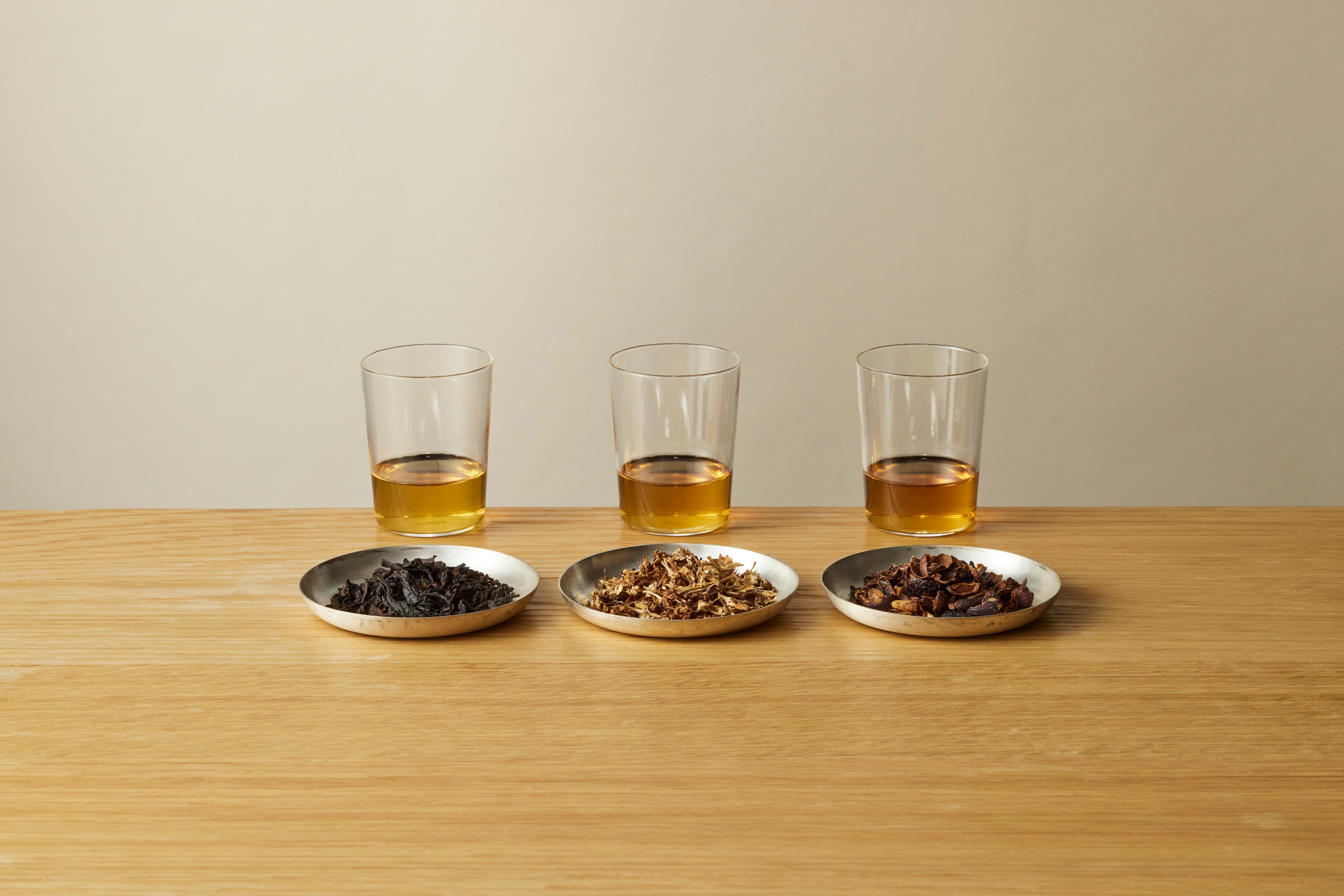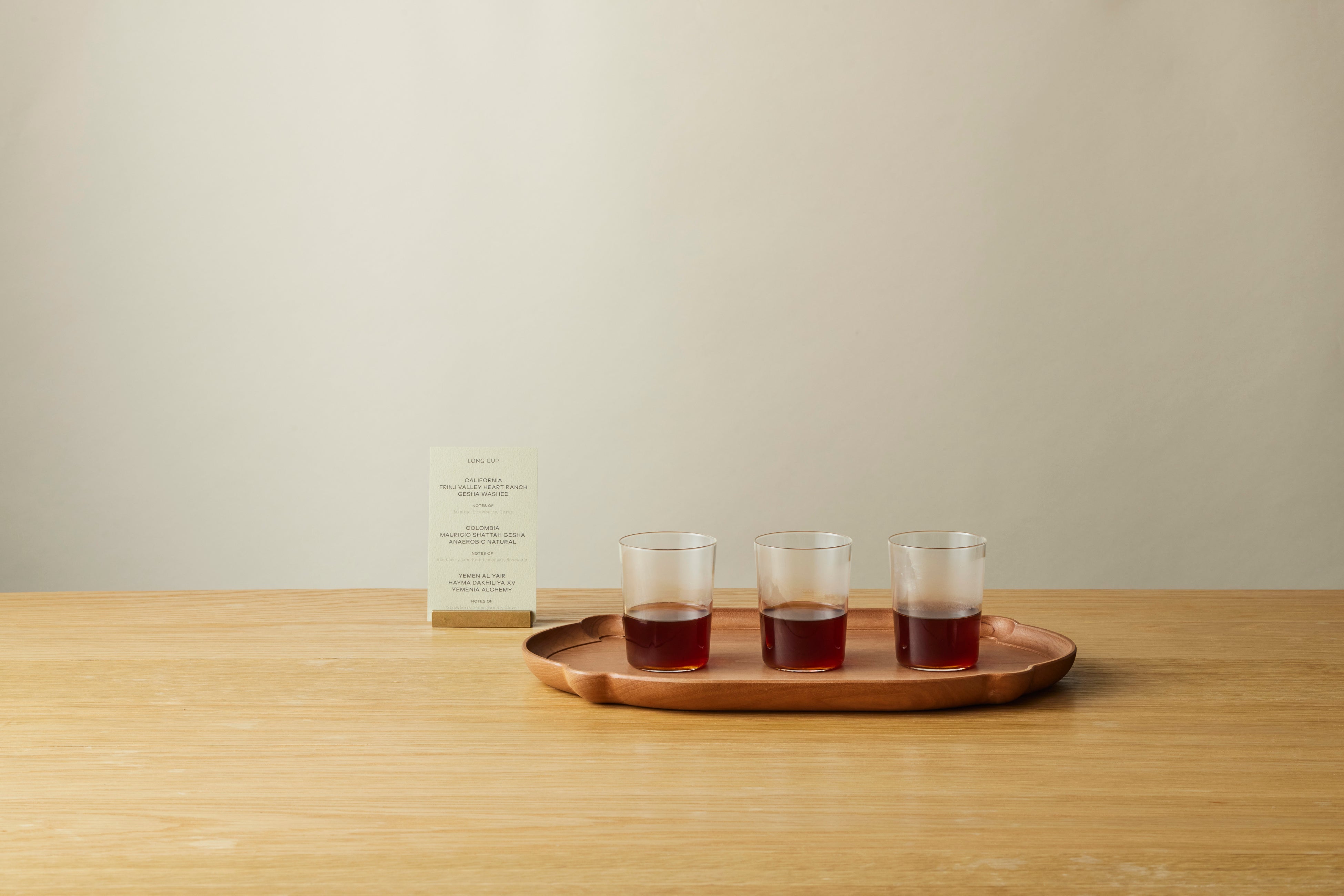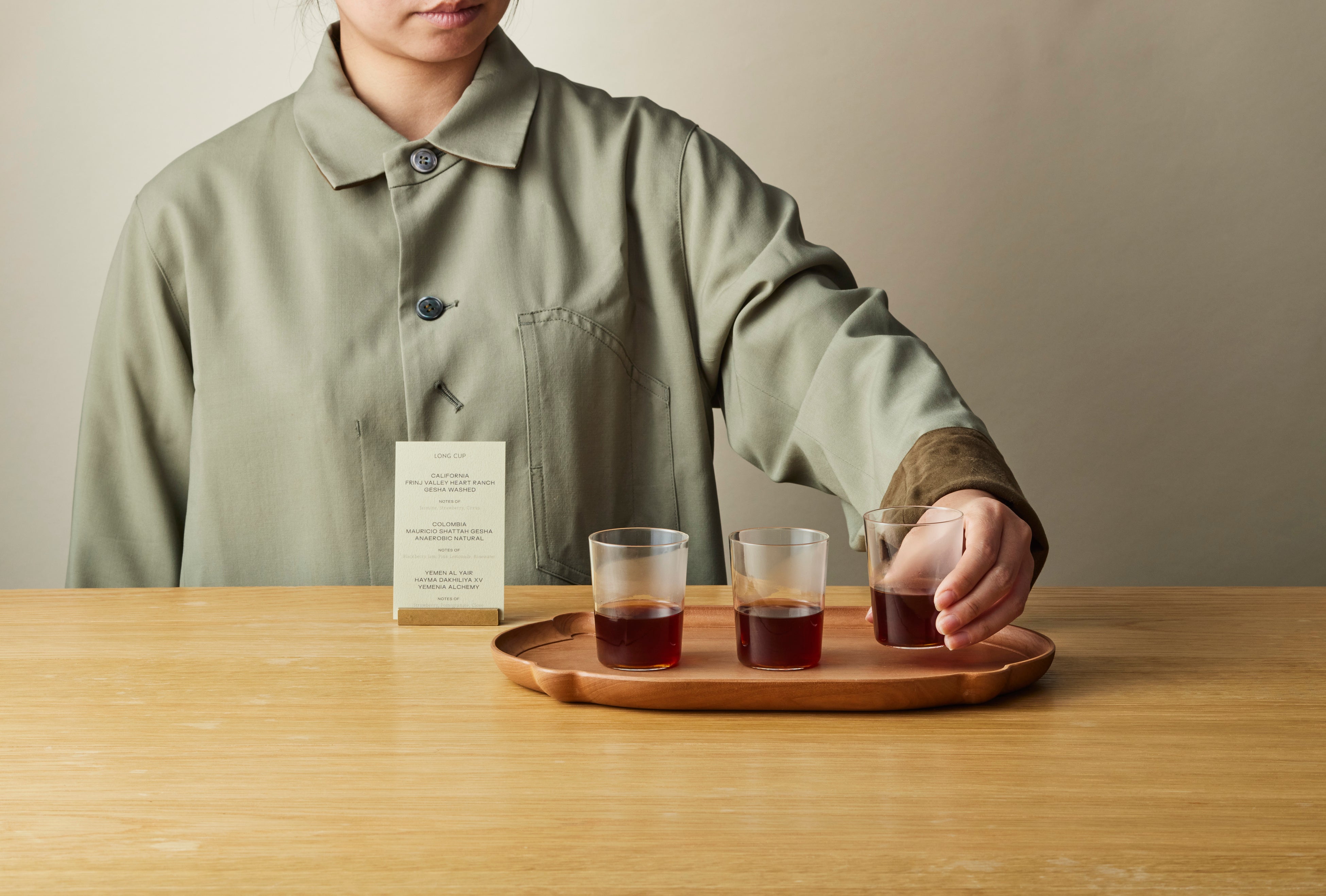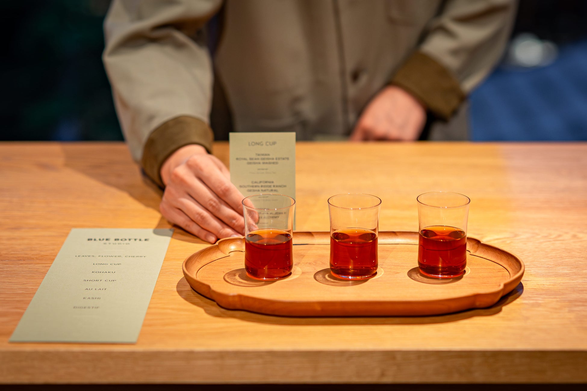 「Blue Bottle Studio - Kyoto -」では、各回5席限定でドリンク6種、スイーツ3種からなるコーヒーコースをご提供いたします。それぞれのメニューが、これまでにないコーヒー体験へとみなさまを誘います。コースはコーヒーの葉、花、果実を余すことなくお楽しみいただける「リーフ、フラワー、チェリー」の3種のオリジナルドリンクから始まります。今回はマラウイ産コーヒーの葉、マレーシア産リベリカ種の花、果実を使用しご用意いたしました。コーヒーノキの普段味わうことのない、さわやかで多様な側面をお楽しみいただけます。続けてお楽しみいただくのは、インド産のエクセルサ種を自社でロースト、抽出、結晶化の工程を全て行い、コーヒーが持つ本来の豊かなアロマと味わいを最大限に引き出した特別なインスタントコーヒー「Soluble(ソリュブル)」。新たな視点で厳選したコーヒー豆3種のフライトセットである「Long Cup(ロングカップ)」では、ブルーベリーや麦茶のような香ばしさを感じられるリベリカ種や、グアバや熟したバナナなどのトロピカルなフレーバーが特徴のエクセルサ種をお楽しみいただけます。これらのコーヒー豆は世界の約2〜4%と非常に少ない生産量ですが、コーヒーの未来にとって大きな可能性を秘めています。アラビカ種と異なり、低木ではなく根の深い樹木として生育し、大きな果実を実らせます。根を深く伸ばし、干ばつなどの厳しい環境に耐えられたり、低い標高でも育てることができるため、高い気温でも栽培することができたりとサステナブルなコーヒーでもあります。そのほか、ジェームスが大きく影響を受けた喫茶店文化から着想を得たメニューや、スイーツ3点をご用意しております。