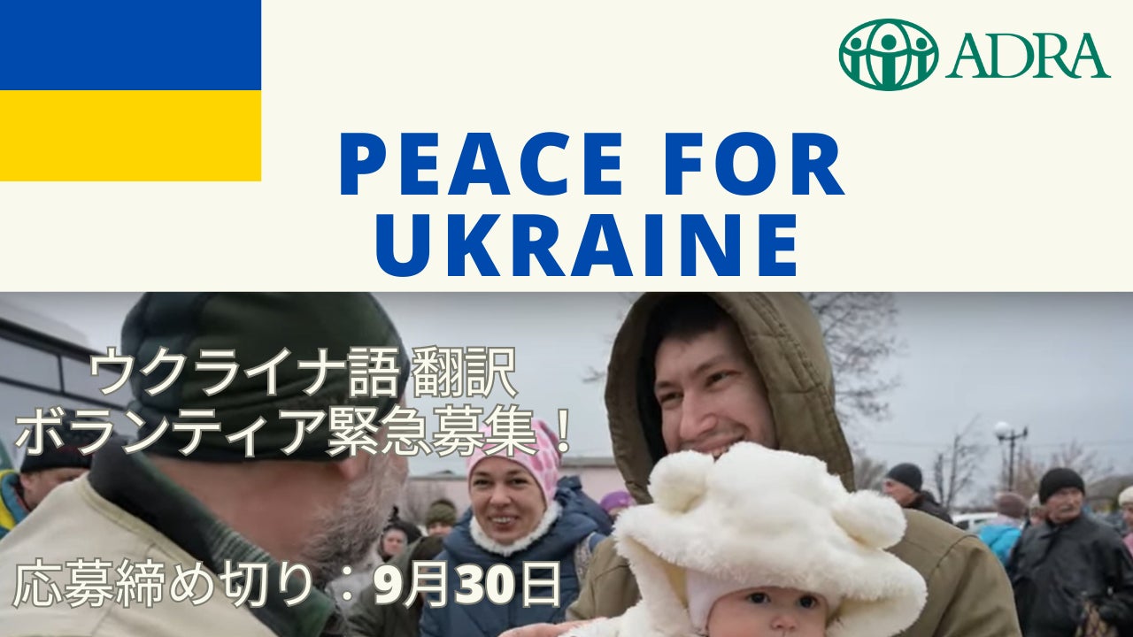 認定NPO法人ADRA Japan(アドラ・ジャパン)(所在地:東京都渋⾕区神宮前1-11-1 理事長:柴⽥俊生)では、ウクライナ語翻訳を行うボランティアを募集いたします。ADRAは、ウクライナ国内および周辺国において、戦争下で暮らす人々や、避難生活を送る方々に寄り添い、なさまざまな活動を展開しています。この度、ウクライナから届く動画などを日本語にし、日本でご支援いただいている方やウクライナのことを気にかけている方に報告できるよう、ウクライナ語の翻訳をお手伝いくださる短期ボランティアの募集を開始することとなりました。