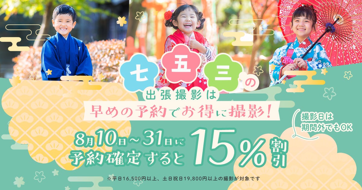 そこで、このたび「OurPhoto」では、より多くの方に七五三の1日を特別な思い出として写真に残してほしいという思いから、七五三オフシーズンである8月9月に、早めに予約するほどお得になり、最大15%割引になる「七五三の出張撮影は早めの予約でお得に撮影!」キャンペーンの実施に至りました。