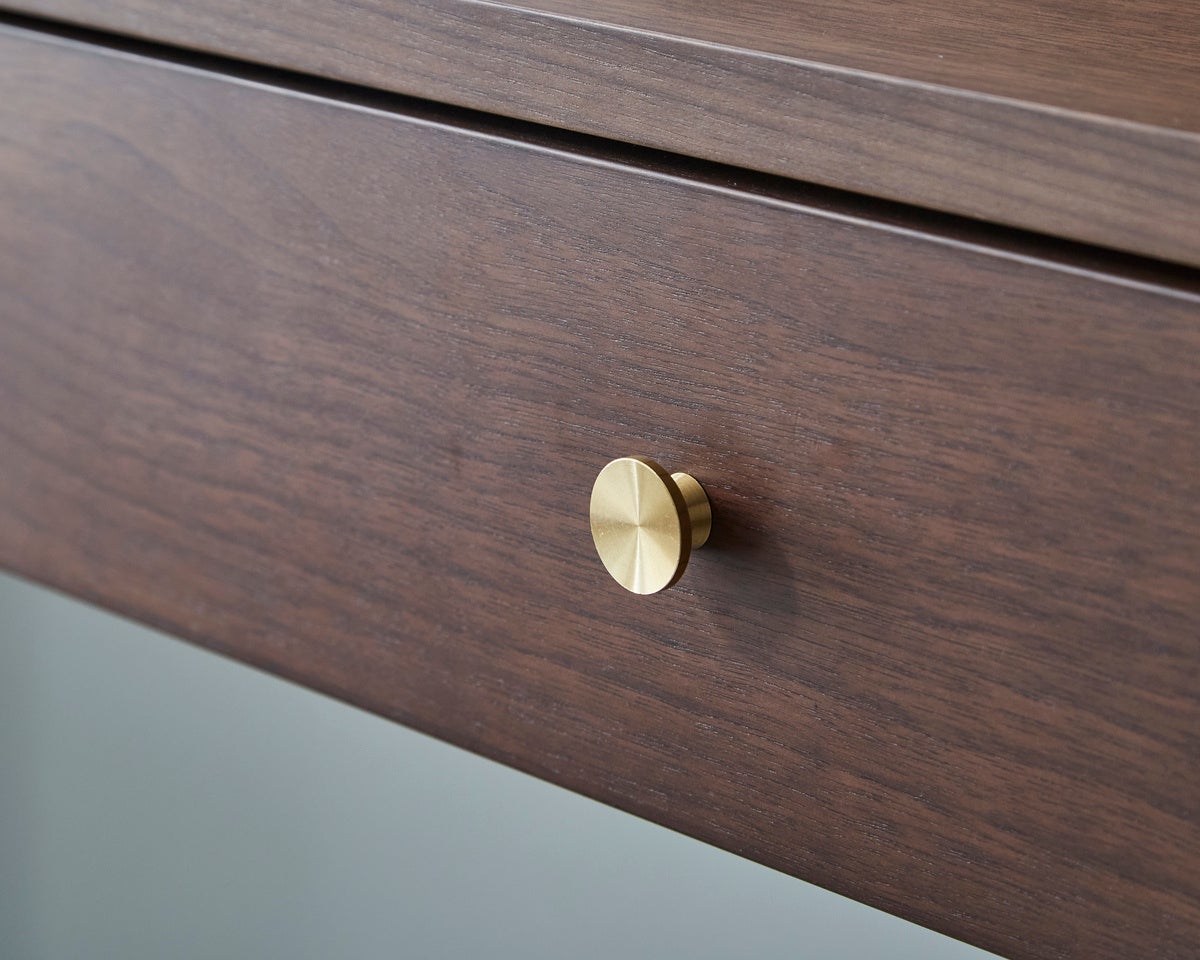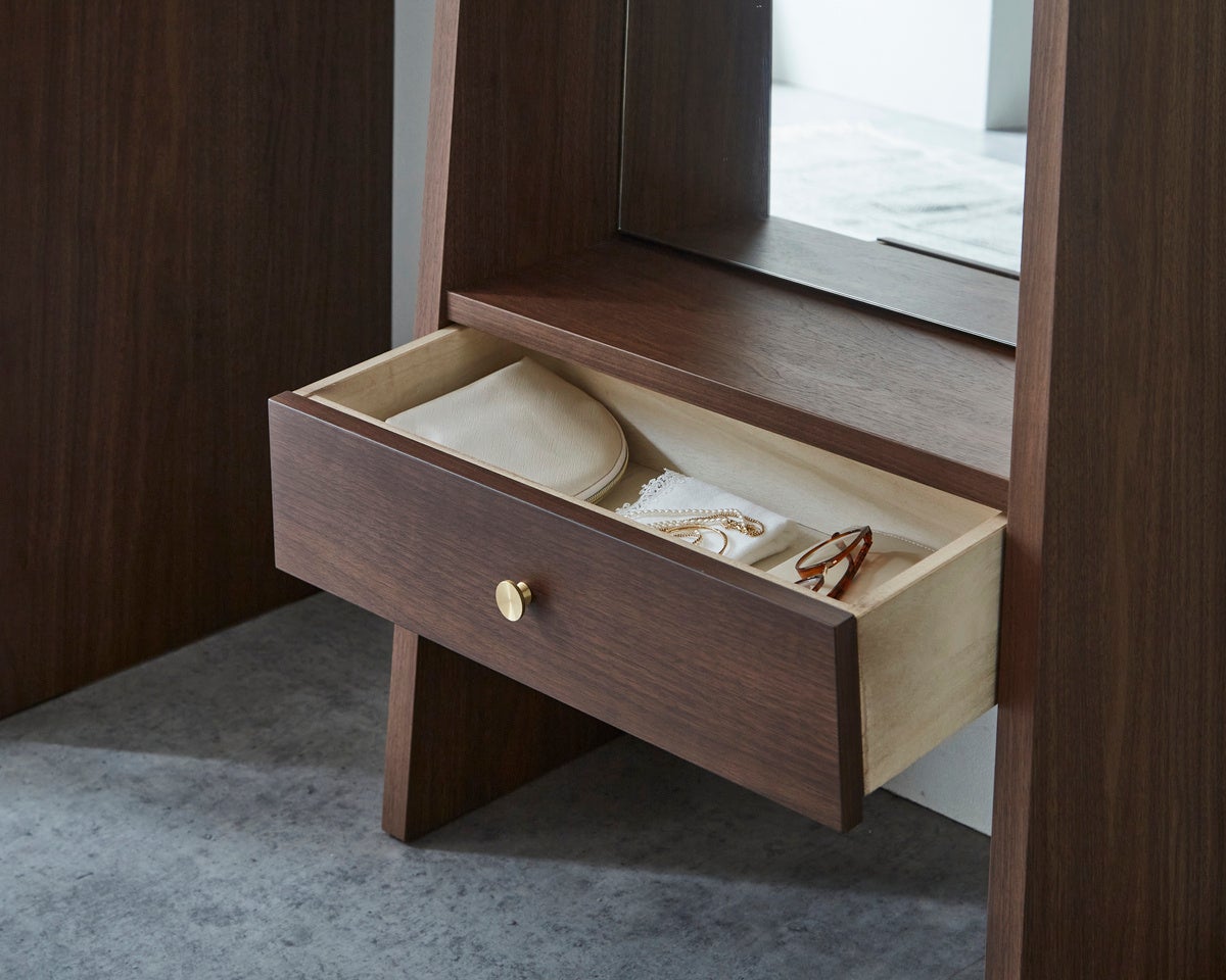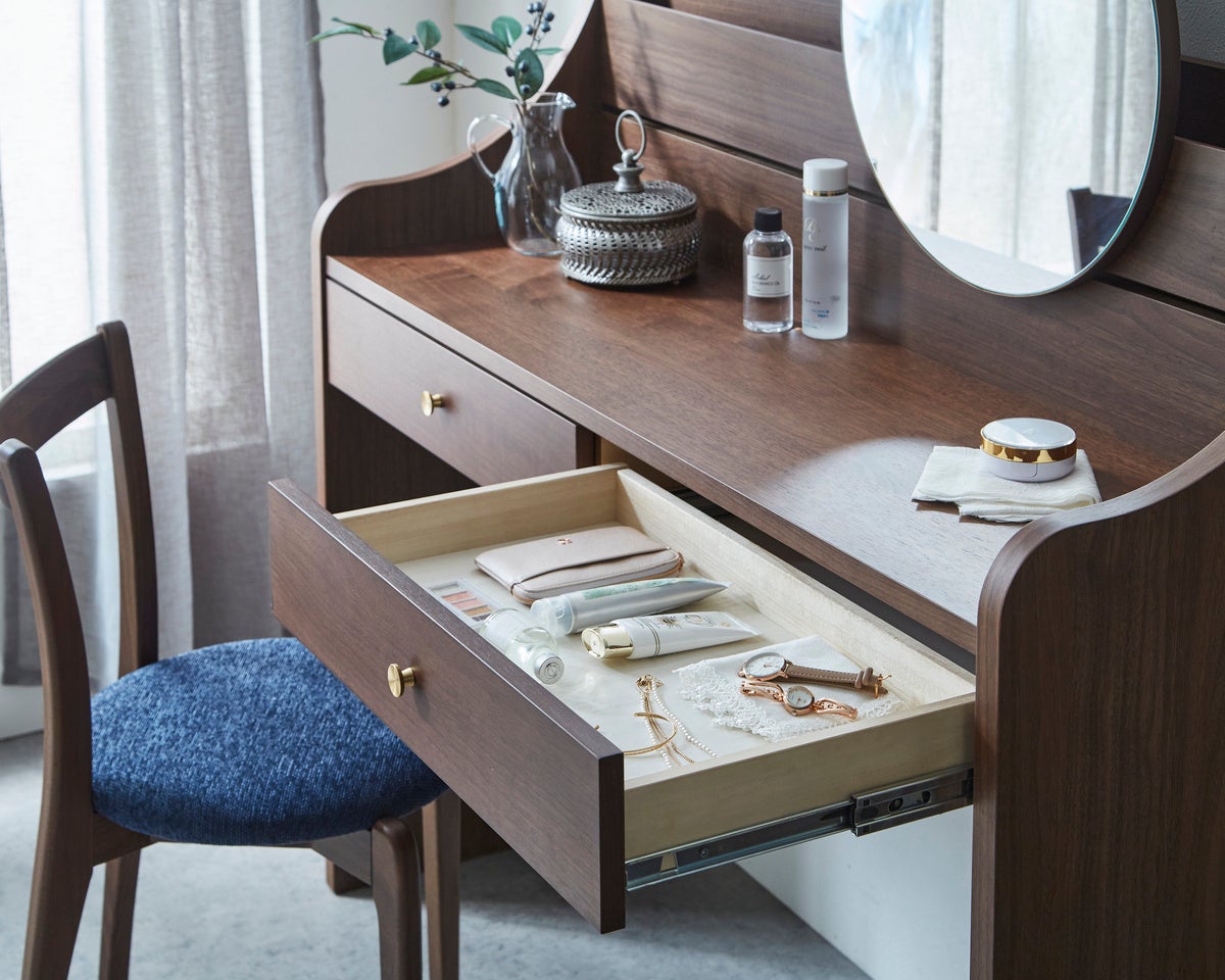 デスクは曲線をメインにデザインし、75幅・120幅と小ぶりな2サイズを展開。気が利いた収納とコンセントを付け、使いやすさも意識しています。同シリーズのミラーを組み合わせることで、現代の住宅にも合わせやすい軽やかなドレッサーとしてお使いいただけます。