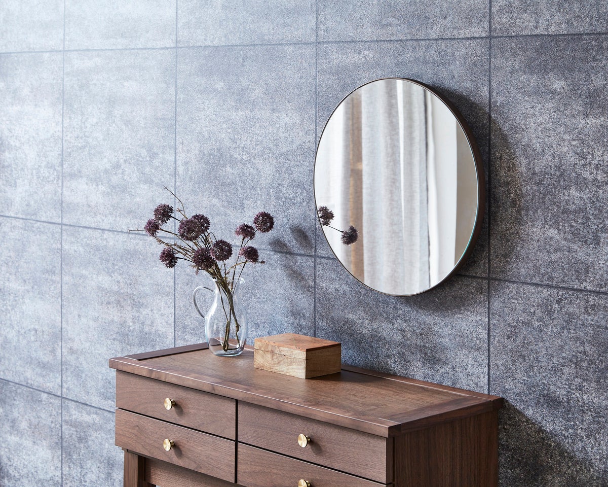 大ぶりの正円が美しい鏡。同シリーズのデスクには、高さ3段階調整で自由に取り付けが可能です。壁付けとして単品でもお使いいただけます。※デスク用・壁付け用の2種類の部品を同梱