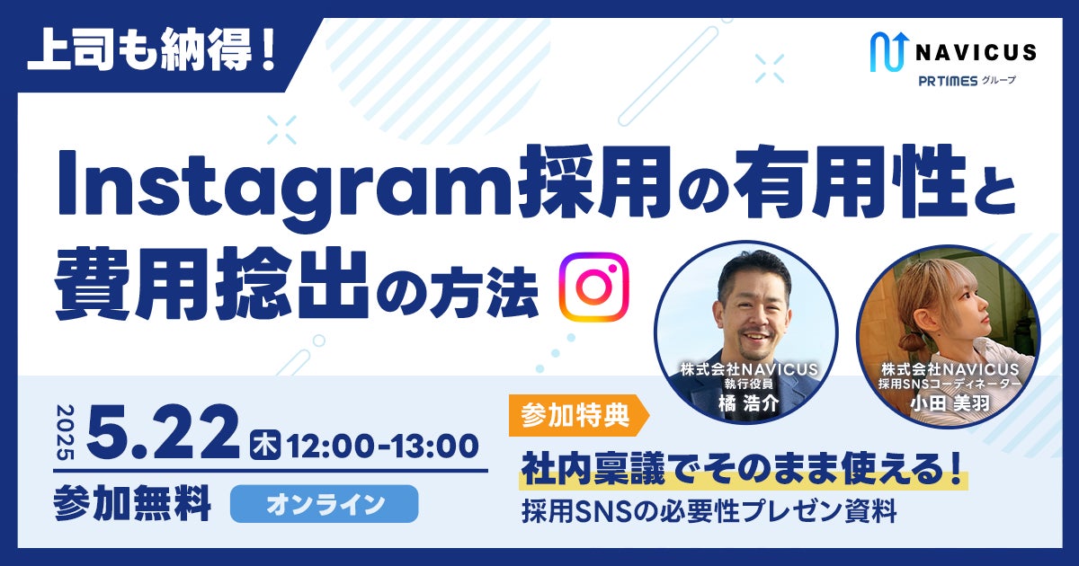 ご支援先の累計フォロワー数が1億620万人を超えている株式会社NAVICUS(本社:東京都千代田区、代表取締役:武内 一矢、以下:NAVICUS)は、2025年5月22日(木)に無料ウェビナー「上司も納得!Instagram採用の有用性と費用捻出の方法 〜社内稟議資料プレゼント!〜」を開催いたしました。