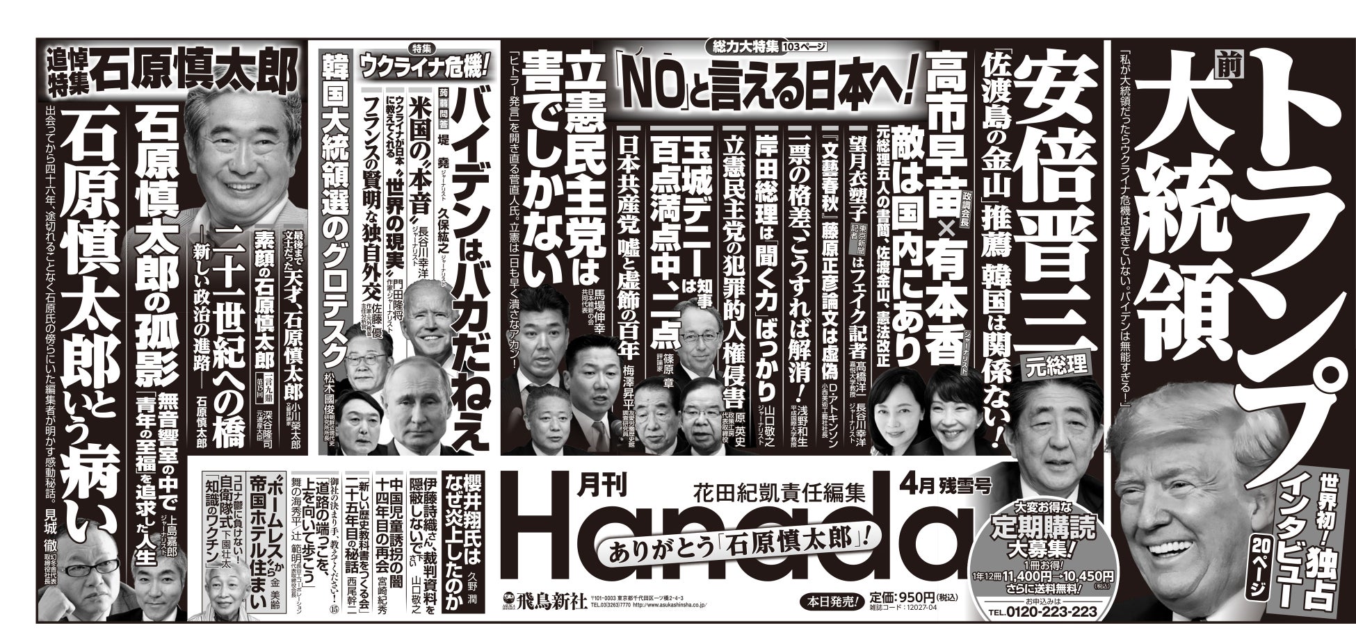 トランプ前大統領が2月25日発売の月刊『Hanada』4月号で、ウクライナ危機をはじめ中国、アフガン、イラン、バイデン政権、メディア問題に至るまで、全てを本音で語る!