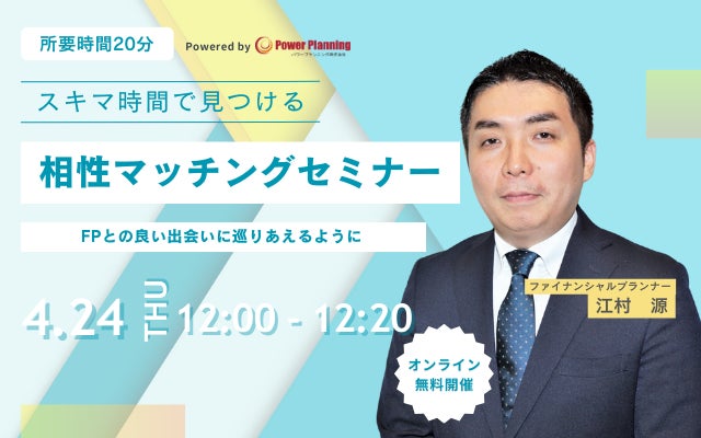 4月24日 (木)12時より、スキマ時間を活用して自分に合ったFPを探すことができる、 江村 源講師との「相性マッチングセミナー(無料)」を開催いたします。