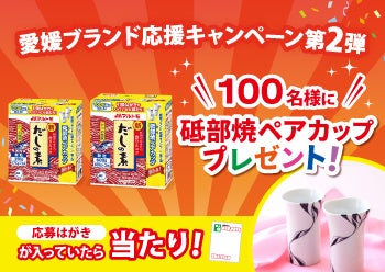 愛媛ブランド応援キャンペーン第2弾!引換はがきが入っていたら当たり! 「砥部焼ペアカップ」が当たる!新鰹だしの素350g、新鰹だしの素600gにて実施中