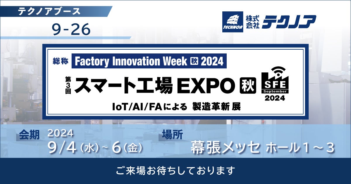 株式会社テクノア(本社:岐阜県岐阜市、代表取締役:山﨑 耕治)は、9/4~6に 幕張メッセ で開催される「 Factory Innovation Week [秋] 2024 」に出展いたします。