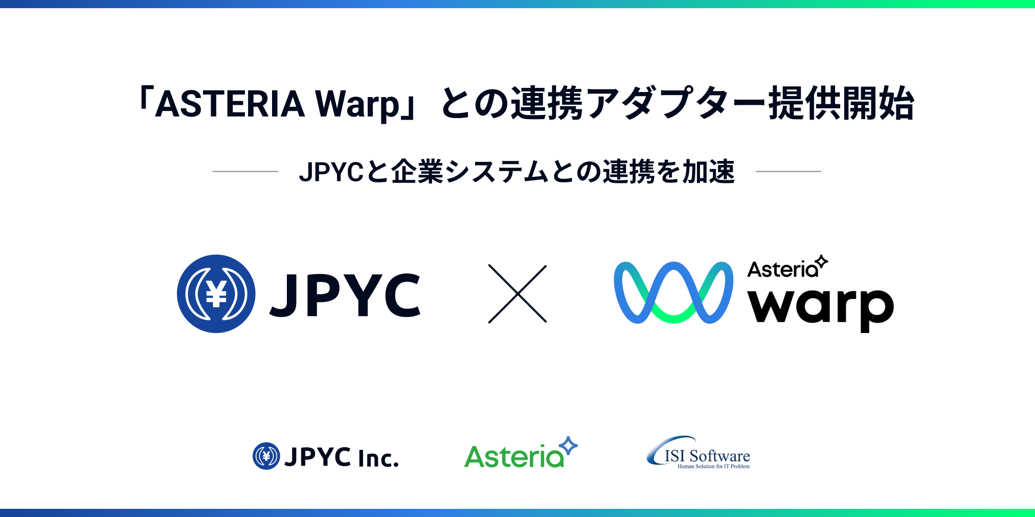 株式会社アイ・エス・アイソフトウェアー(大阪市中央区、代表取締役社長:前田 丈彰、以下:ISIソフトウェアー)が開発するASTERIA Warpとブロックチェーン基盤Ethereum上のERC20を接続する新しい「ASTERIA Ethereum アダプター」をリリースいたしました。これにより日本円連動ステーブルコイン「JPYC」が様々な企業システムとノーコードで連携可能となりました。