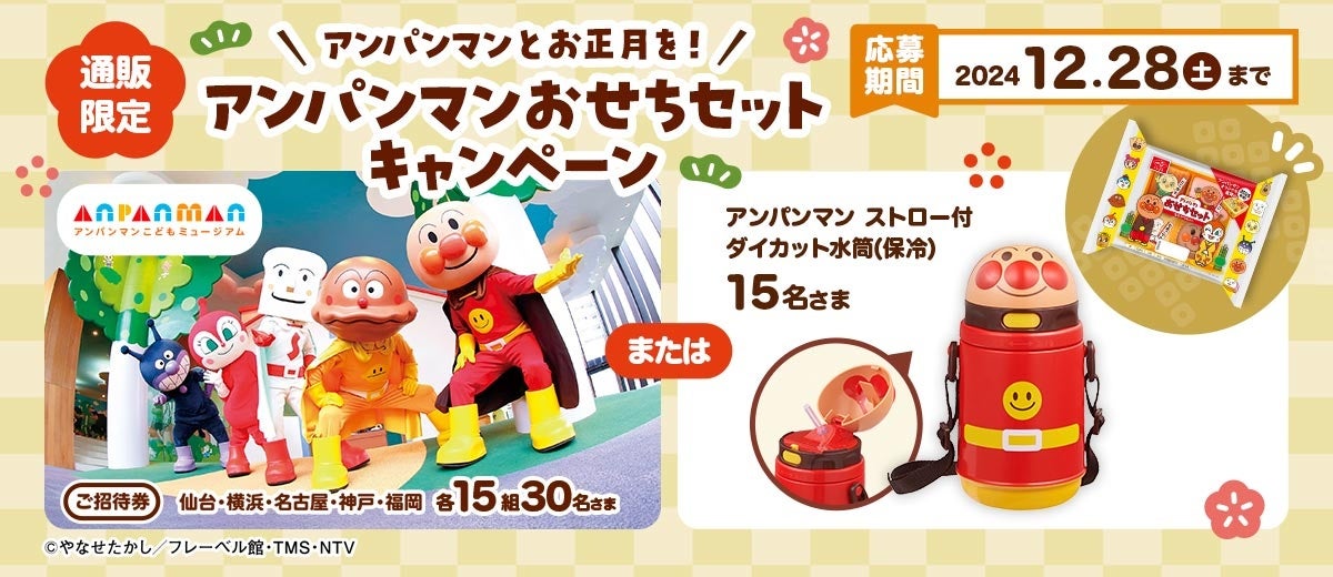 アンパンマンとなかまたちが描かれたかわいいミニ重箱で、おうちの方といっしょにお重詰めを楽しめます。当社の通信販売で「アンパンマンおせちセット」をご購入いただいた方の中から抽選で合計165名さまに、「アンパンマンこどもミュージアム招待券」、または「アンパンマン ストロー付ダイカット水筒(保冷)」をプレゼントします。