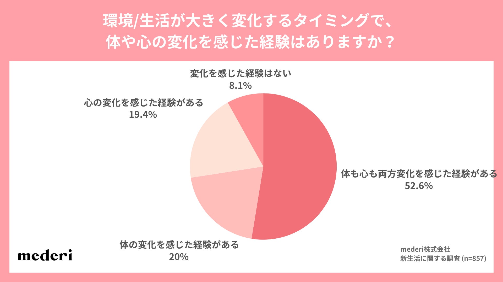 ②9割以上が環境や生活が大きく変化するタイミングで体や心の変化を感じた経験あり、約5割が体と心の両方の変化を感じた経験ありと回答。