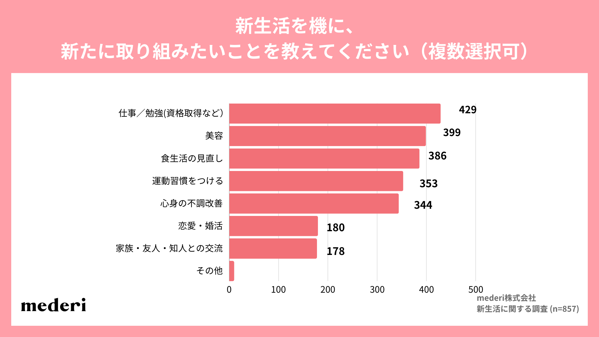 ①新生活を機に新たに取り組みたいことは、1位:仕事/勉強(429名)、2位:美容(399名)に次いで、3位:食生活の見直し(386名)や4位:運動習慣をつける(353名)、5位:心身の不調改善(344名)。
