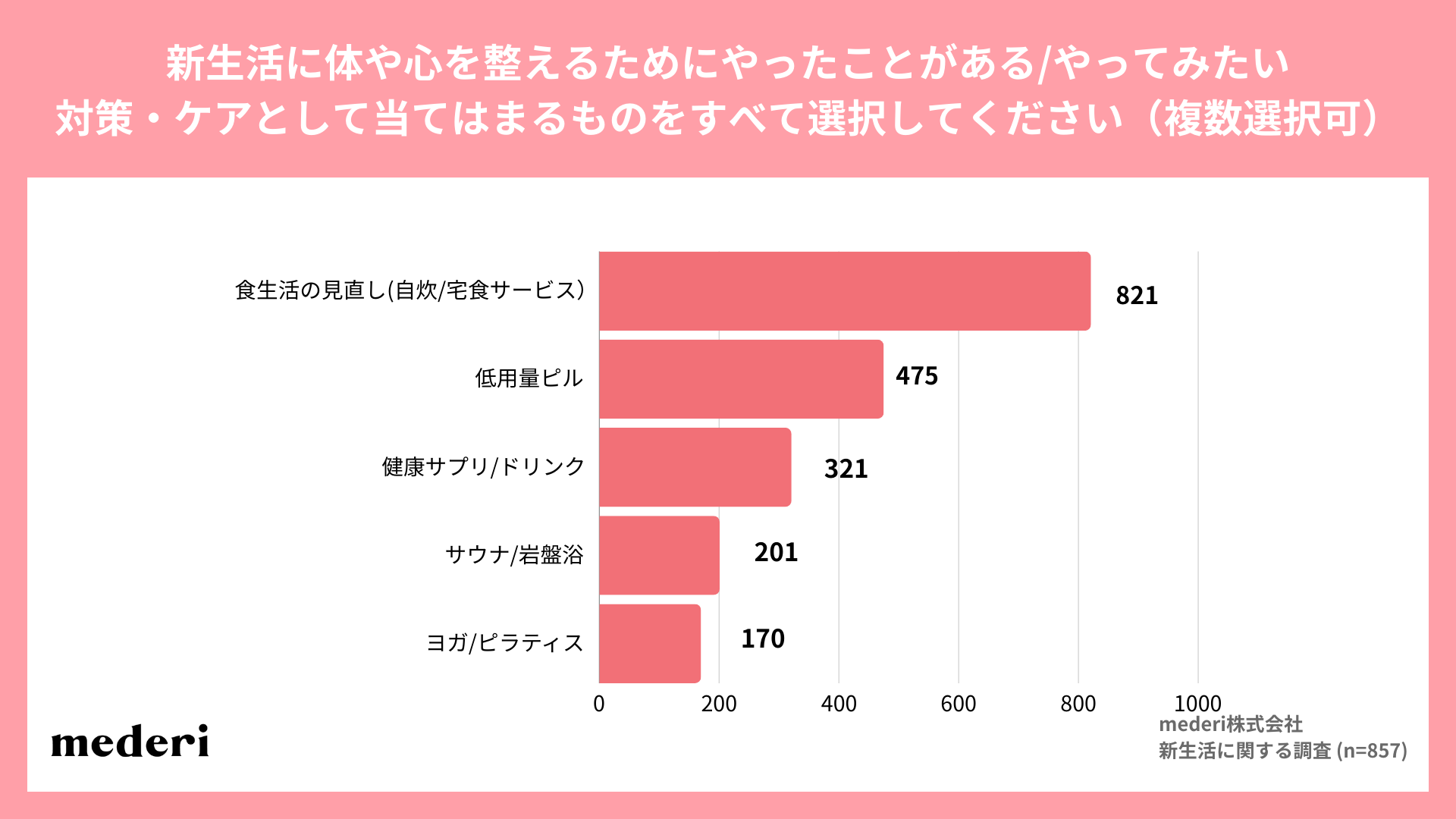 新生活の心身ケア方法として想起されるのは、1位:食生活の見直し、2位:低用量ピルの服用、3位:健康サプリや健康ドリンクという結果に