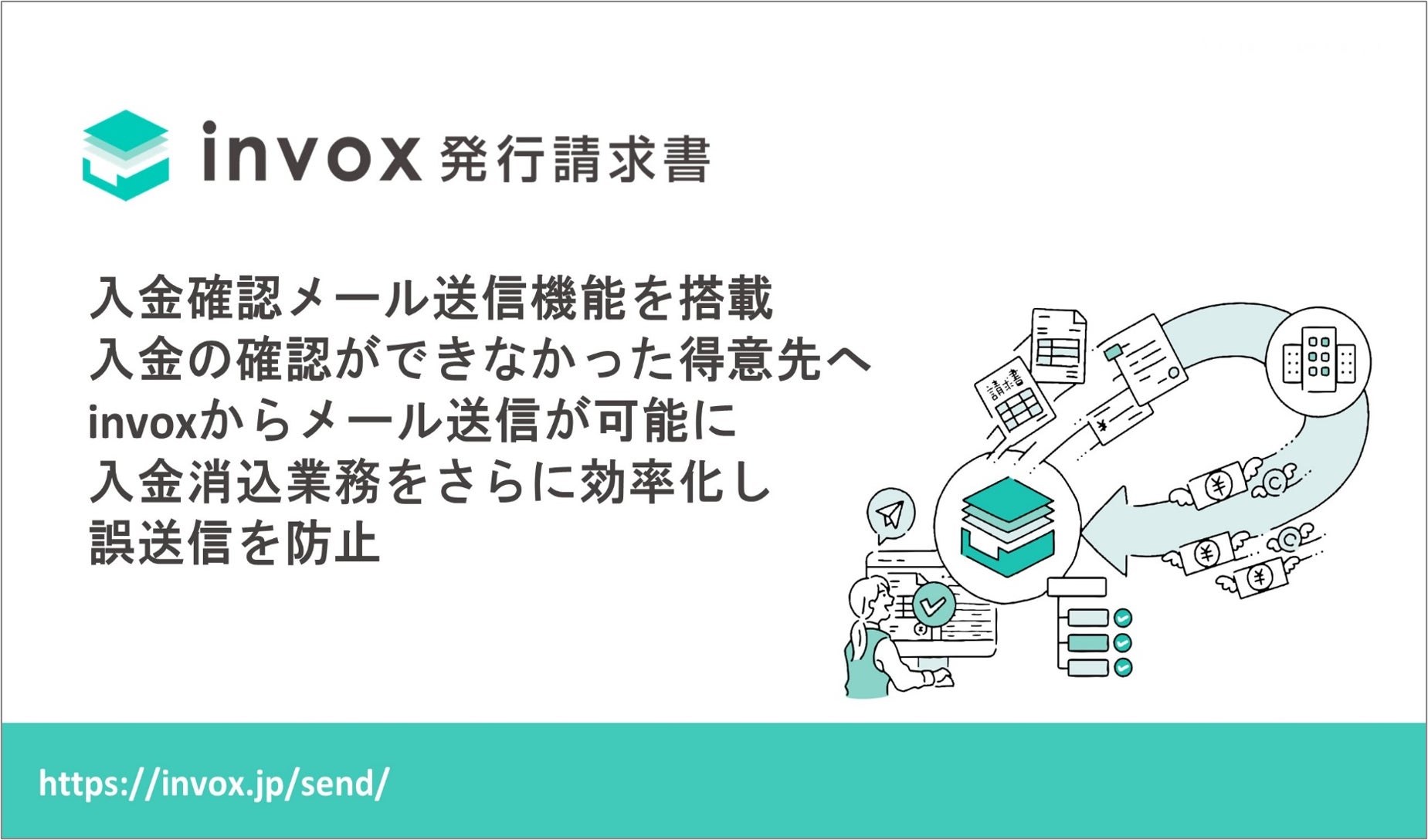 株式会社invox(本社:東京都新宿区、代表取締役:横井 朗)が開発・運営する「invox発⾏請求書(https://invox.jp/send/)」は、入金確認メール送信機能を搭載いたしました。本機能をお使いいただくことで、入金消込業務から入金が確認できなかった得意先への督促業務までワンストップで行っていただけます。
