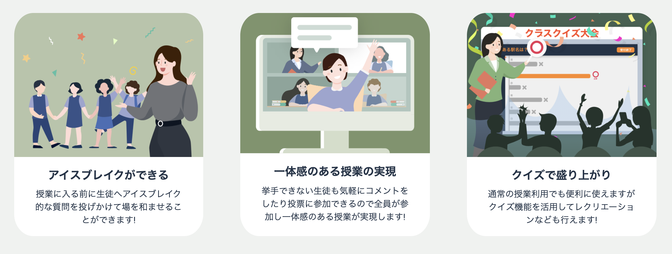 オフラインでもオンラインでも教師と生徒が双方向でやり取りし、学校を楽しく盛り上げます!