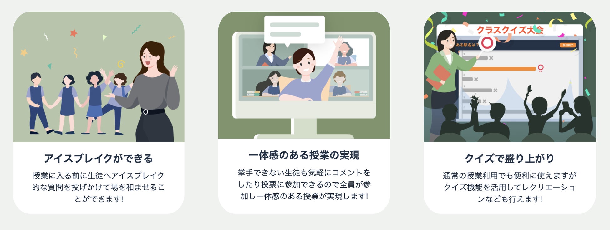 授業に入る前のアイスブレイク、授業中における挙手、選択肢の投票など参加感の醸成、事業外におけるレクリエーションなどご活用の場は様々です。