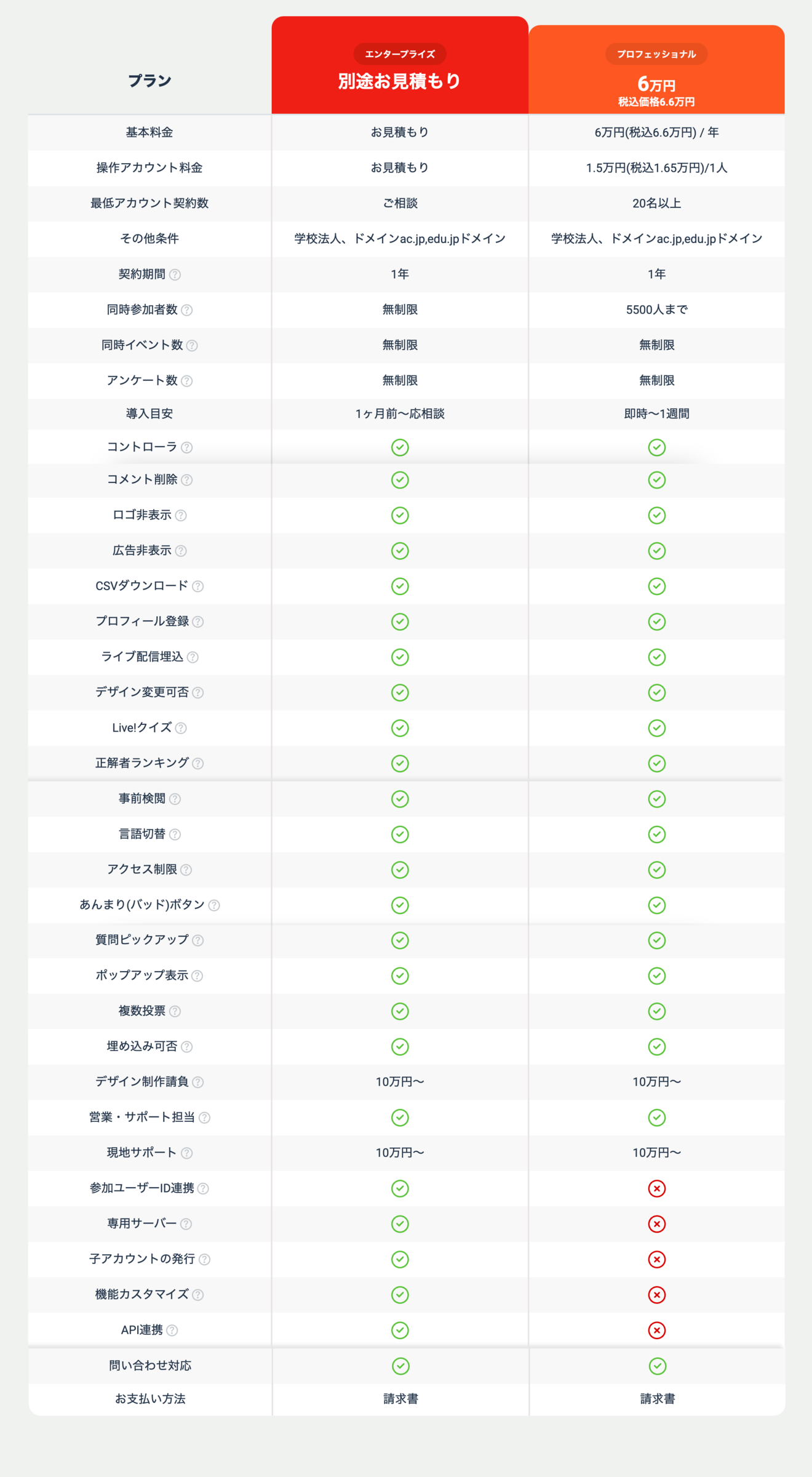 Live!アンケートの活用でオンライン・オフライン問わず、授業や全校業務、部活動、課外活動における体験のアップデート、盛り上がりの拡大を実現いたしますので、この機会に是非お問い合わせください。