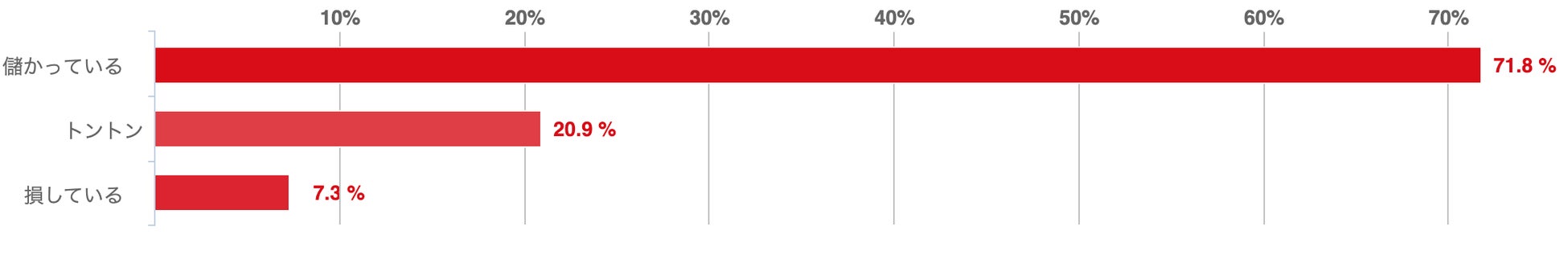 アンケートによれば、「儲かっている」が71.8%と大多数を占める結果となった。一方で「トントン」、すなわち損失と利益が相殺されている人は20.9%、「損している」人は7.3%に留まった。