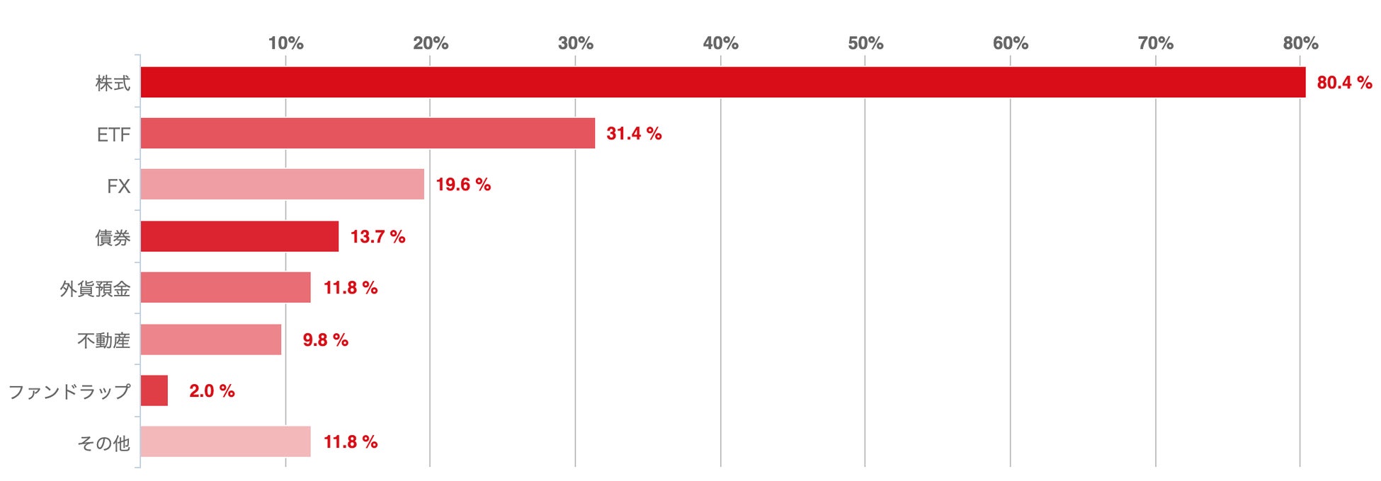 アンケートによれば、「株式」に投資している人の割合が80.4%で圧倒的に高く、これに「ETF(31.4%)」と「FX(19.6%)」が続く形となった。