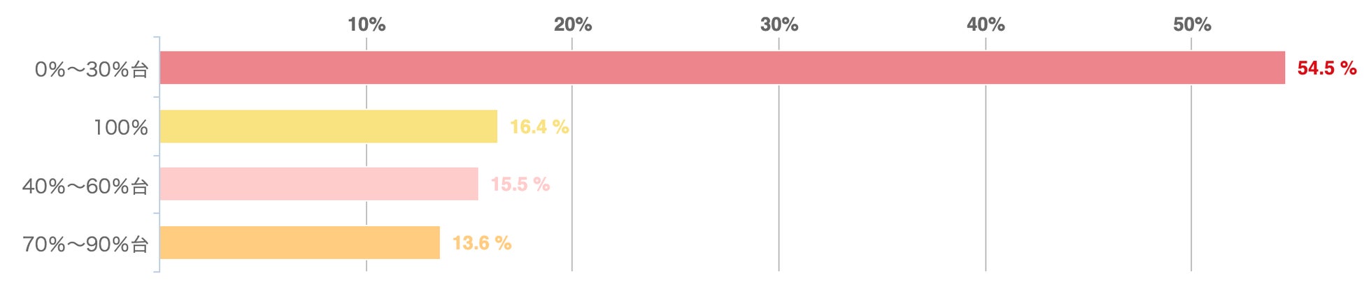 アンケートによれば、「0%〜30%台」が54.5%で最も多くなった。次いで、「100%」が16.4%、「40%〜60%台」が15.5%、「70%〜90%台」が13.6%となっている。