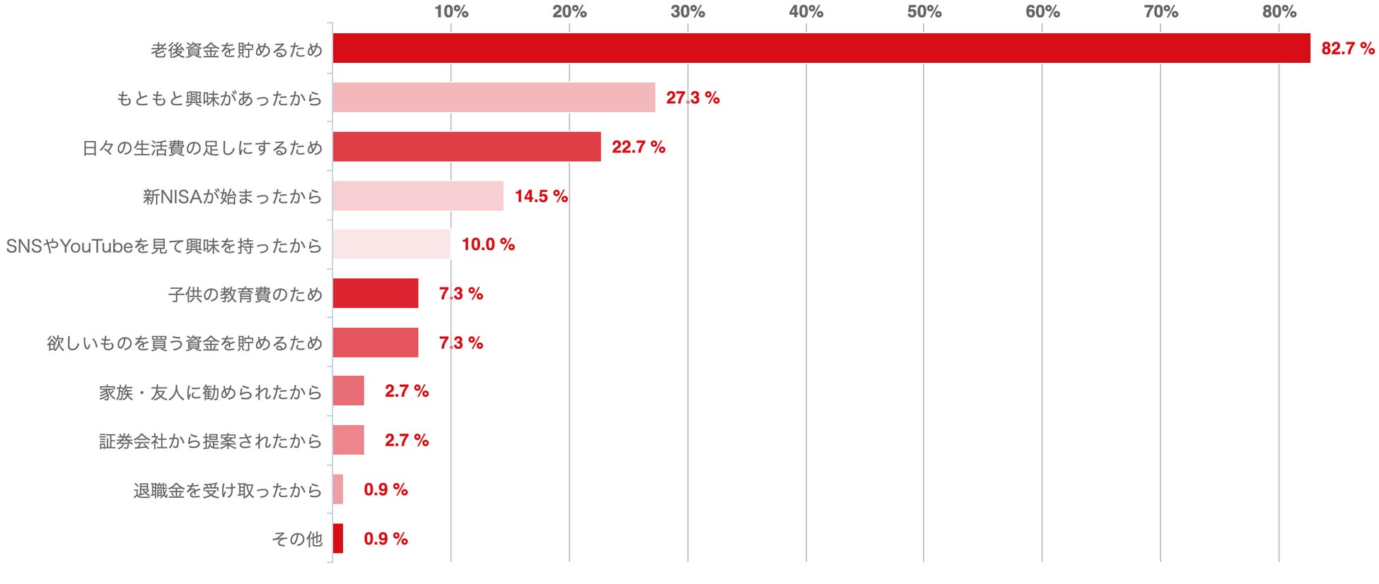 50代が投資信託を始めた理由としては「老後資金を確保するため」が82.7%で最も多かった。この結果から、安定して資産形成を行う手段として投資信託が選ばれていることがわかった。