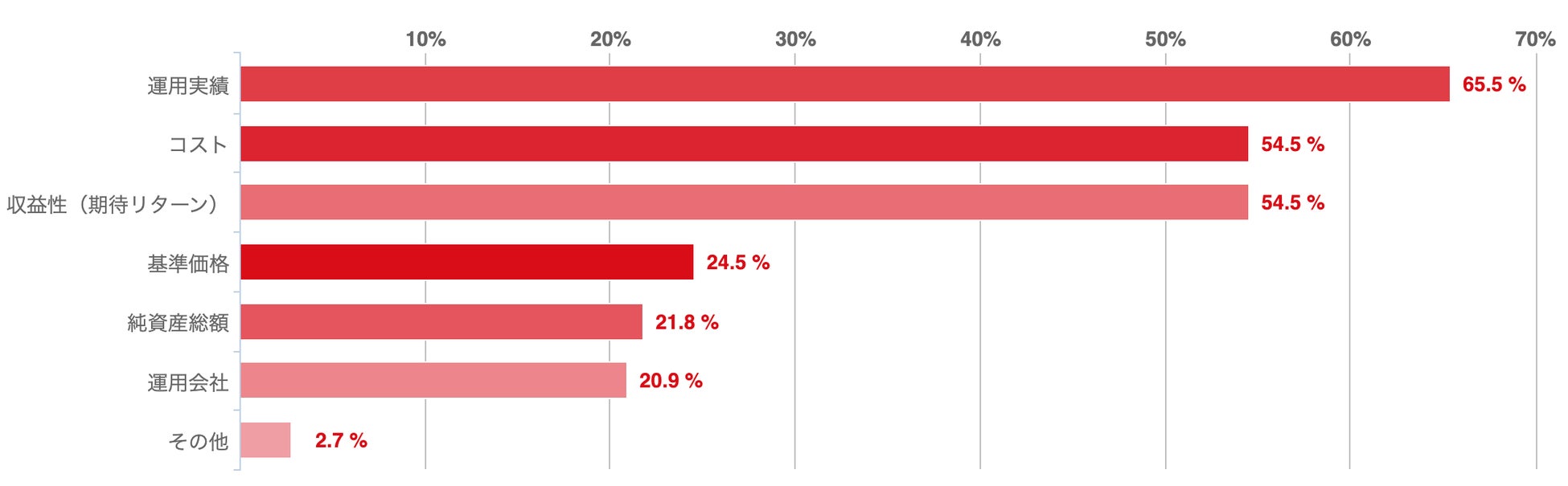 また、「基準価格(24.5%)」や「純資産総額(21.8%)」、「運用会社(20.9%)」を重視している回答者もいることから、50代の投資信託選定基準が多種多様となっていることが読み取れる。