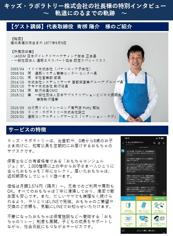 キッズ・ラボラトリー株式会社は、2019年5月17日に設立された「おもちゃのサブスク」サービスです。出産前のプレママから8歳までのお子さまを対象に、知育玩具を定期的にお届けしています。一般的なレンタルとは異なり、専任のおもちゃコンシェルジュが、お子さま一人ひとりに合わせて最適なおもちゃを選び、お届けするのが特長です。