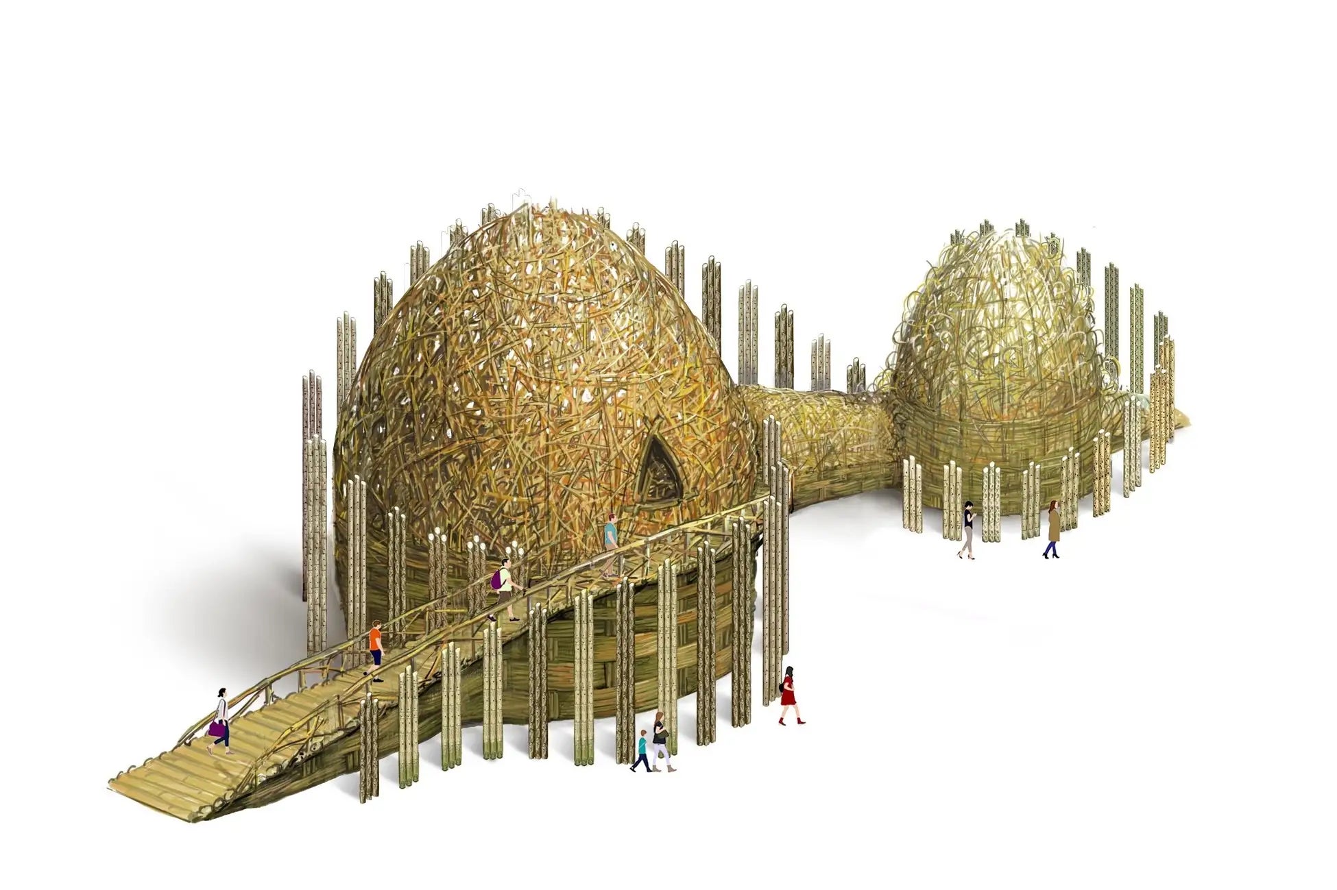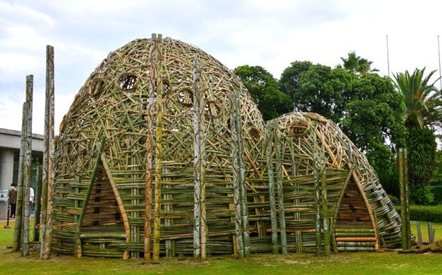 竹で編まれた大小の構造物の組み合わせは、和歌山県の連なる山々から想起されるように、