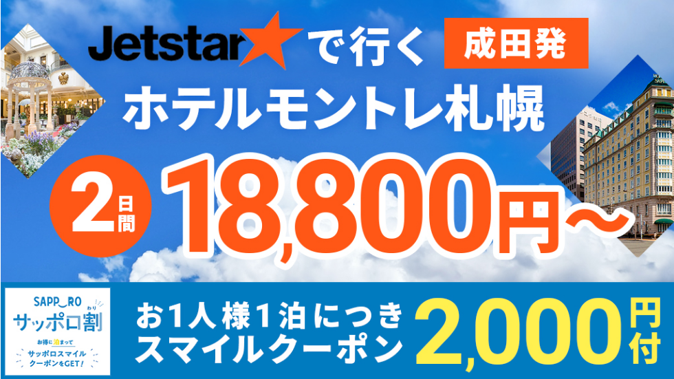 【サッポロ割 ・ 1人1泊に付2,000円クーポン付・先着50泊限定】【関空・成田発着】ジェットスターで行く札幌16,800円~!出発3日前まで予約可能