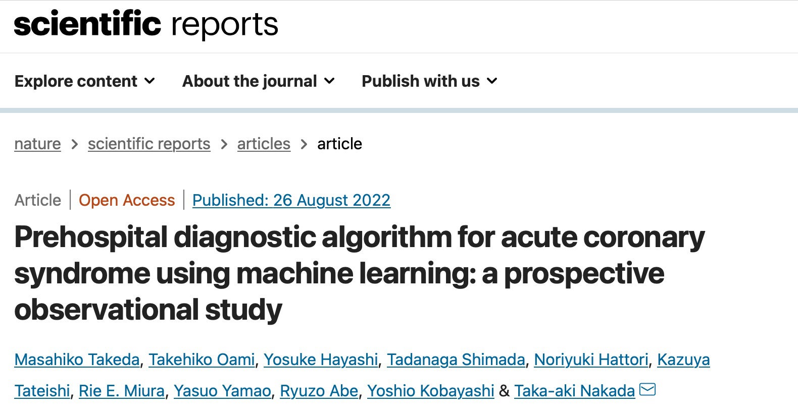千葉大学発医療スタートアップの株式会社Smart119(本社:千葉県千葉市、代表取締役社長/CEO:中田孝明)は、千葉大学大学院医学研究院 救急集中治療医学と共同で、急性冠症候群AI予測診断アルゴリズムの研究を実施しました。本研究開発課題は、日本医療研究開発機構(AMED)の「先進的医療機器・システム等技術開発事業『救急医療予測研究開発』」に採用されております。このたび、本研究の成果をまとめた研究論文(筆頭著者:竹田雅彦、責任著者:中田孝明)が、国際科学誌『Scientific Reports』(英国、Nature Research社発行)に掲載されたことを公表いたします。