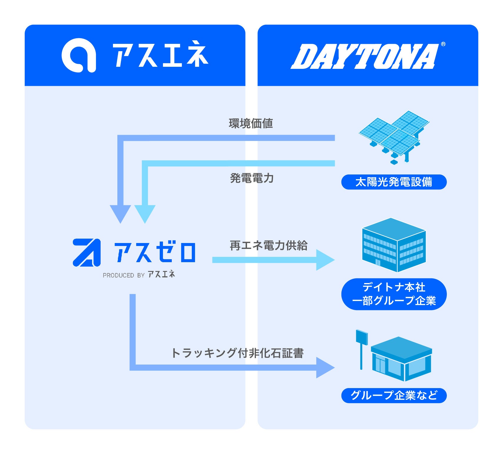 CO2排出量見える化・削減クラウドサービス「アスゼロ」を提供するアスエネ株式会社(本社:東京都港区、代表取締役CEO:西和田 浩平、以下「当社」)は、株式会社デイトナ(本社:静岡県周智郡、代表取締役:織田 哲司、以下「デイトナ」)へ、再生可能エネルギー100%電力とトラッキング付非化石証書を導入しました。アスゼロの脱炭素ワンストップソリューションを通じて、企業の脱炭素経営を支援します。
