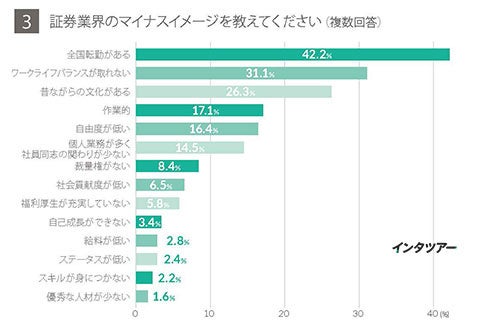最多の回答となった選択肢は「全国転勤がある」42.2%で、全国規模の企業での支店勤務がイメージされているようです。他に多かった回答は「ワークライフバランスがとれない」31.1%、「昔ながらの文化がある」26.3%で、負荷の大きい働き方や古い企業体質がイメージされたようです。