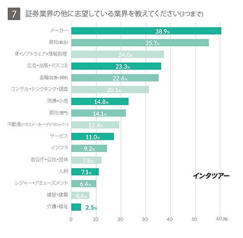 文系学生に聞いた志望業界人気調査等の順位とほぼ似通っており、学生の志望業界選択において証券業界は、一般的な人気業界との競合が発生しているものと考えられます。