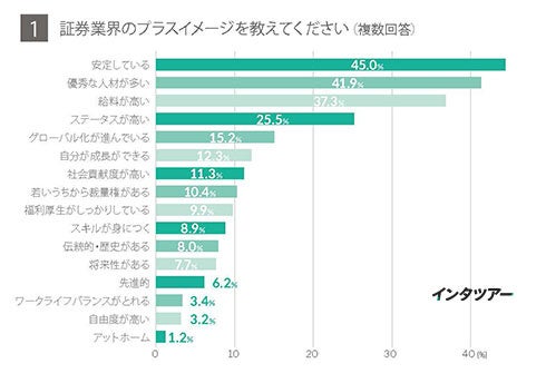 最も回答が多かった選択肢は「安定している」45.0%で、「優秀な人材が多い」41.9%、「給料が高い」37.3%、「ステータスが高い」25.5%が続きました。