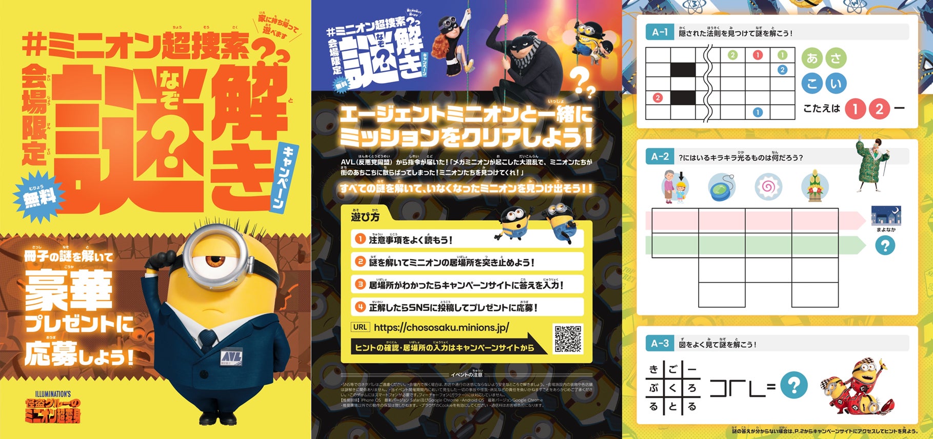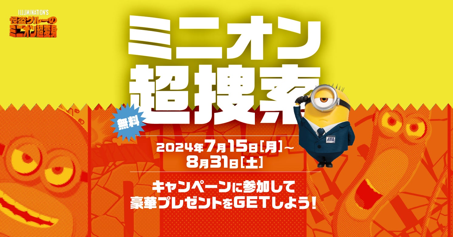 同キャンペーンでは、ミニオンの写真を撮影し SNS 各種( X、Instagram、TikTok )に、ハッシュタグ「 #ミニオン超捜索 」「 #PR 」をつけて投稿すると、抽選で最大 110 名様に豪華プレゼントが当たります。さらに、特設サイトで謎解きに挑戦して、多くの方にミニオンを発見していただくと、その数に応じてプレゼントが豪華になる取り組みも展開。また、幻の謎を誰かが解くことができると、超レアなプレゼントとして、笑福亭鶴瓶さん、片岡愛之助さん、中島美嘉さん、山田杏奈さん、児玉すみれさん、三木眞一郎さん、小林ゆうさん、LiSAさん、ハナコ(秋山寛貴さん、岡部大さん、菊田竜大さん)らの直筆サイン入りポスターも抽選で当たります。