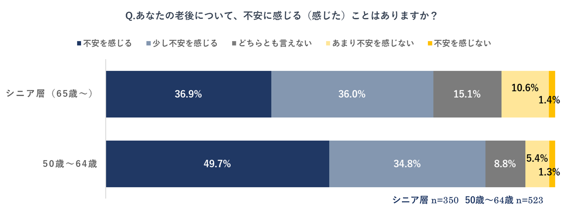 シニア層(65歳以上)で「不安を感じる」「少し不安を感じる」との回答の合計は72.9%。50歳~64歳の回答では同合計が84.5%でした。