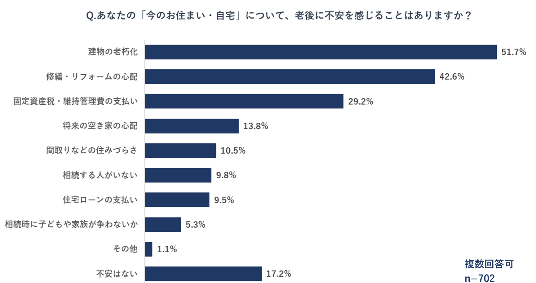 持ち家層に聞いた「持ち家に対する老後の不安」は、建物の老朽化や修繕・リフォームなど対策に一時金が必要となるものや、固定資産税・維持管理費など継続的な出費に、大きな不安が見られます。