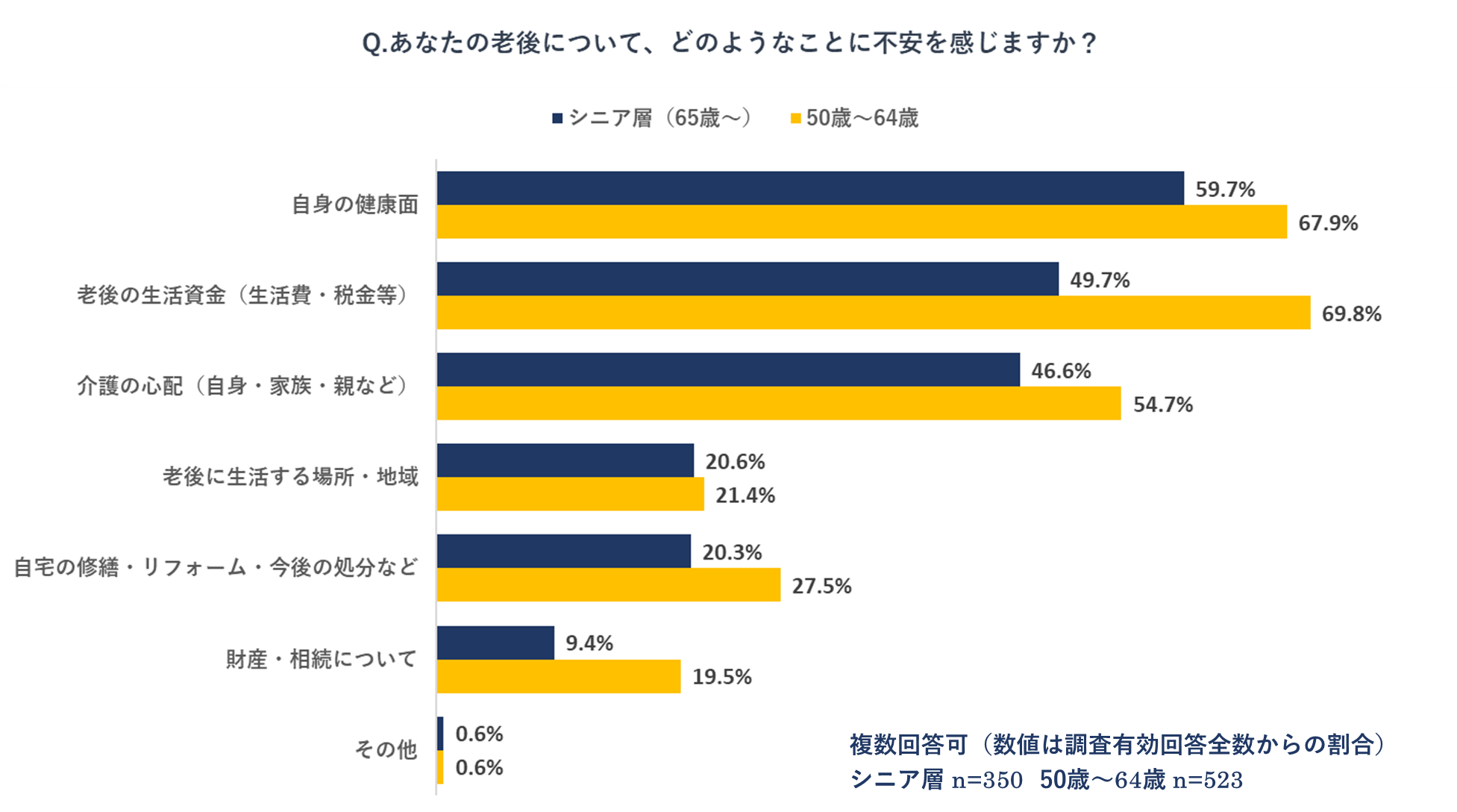 ・シニア層の約5割、50歳~64歳の約7割が「老後の生活資金」に不安があると回答