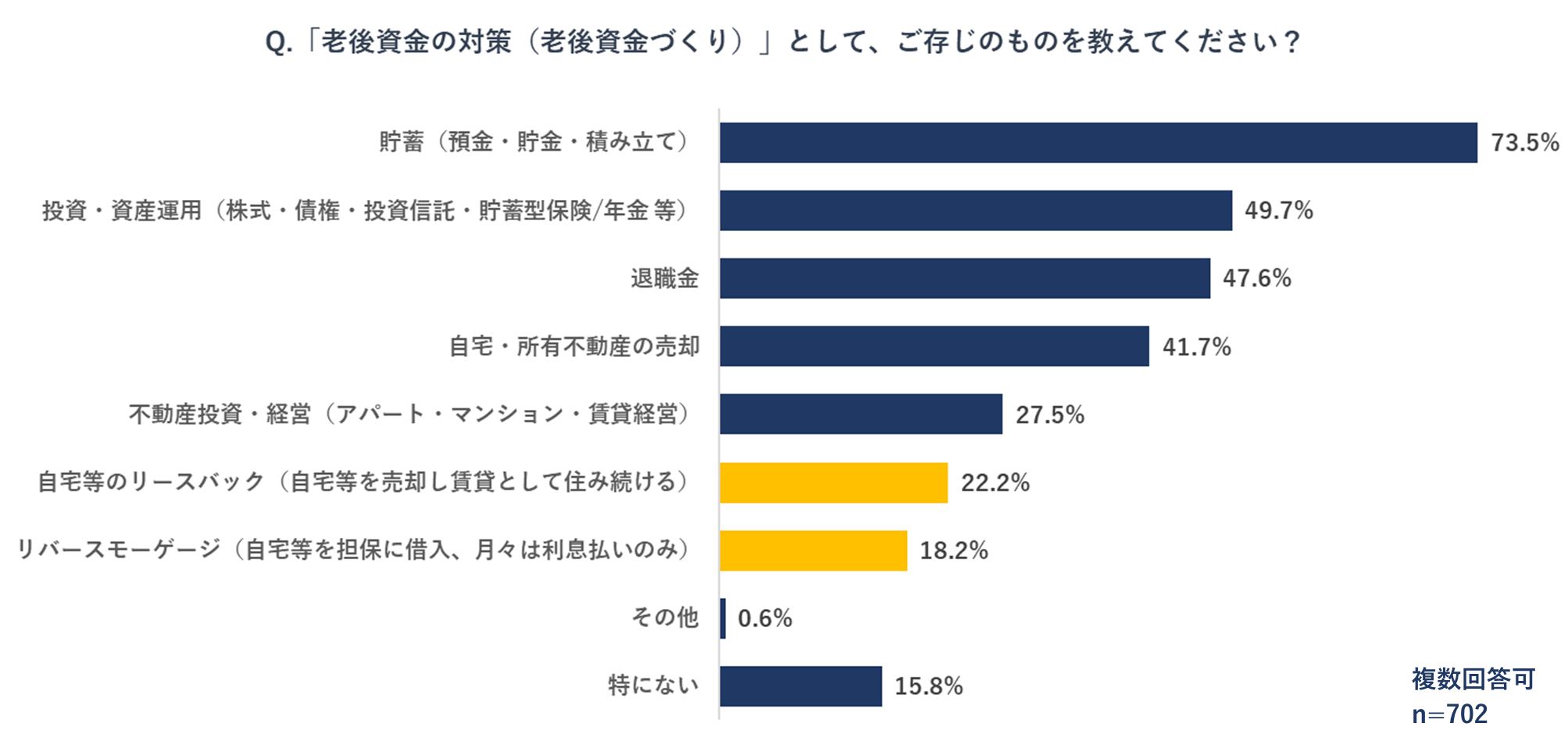 持ち家層の「老後資金対策(老後資金づくり)」としての認知度は、「貯蓄」73.5%、「投資・資産運用」49.7%、「退職金」47.6%が大きな割合を占めています。最近注目される自宅を活用した老後資金対策として、自宅を売却後も賃貸で住み続けられる「リースバック」と自宅を担保に月々支払いは利息のみの「リバースモーゲージ」がありますが、その認知度は2割前後。別の設問「老後、どこに住もうと考えているか?」では、持ち家層の68.5%が「自宅」と回答し、また「自宅・所有不動産の売却」も41.7%と高いことから持ち家層にとって、自宅を活用した老後資金づくりが視野に入っていることがうかがえます。
