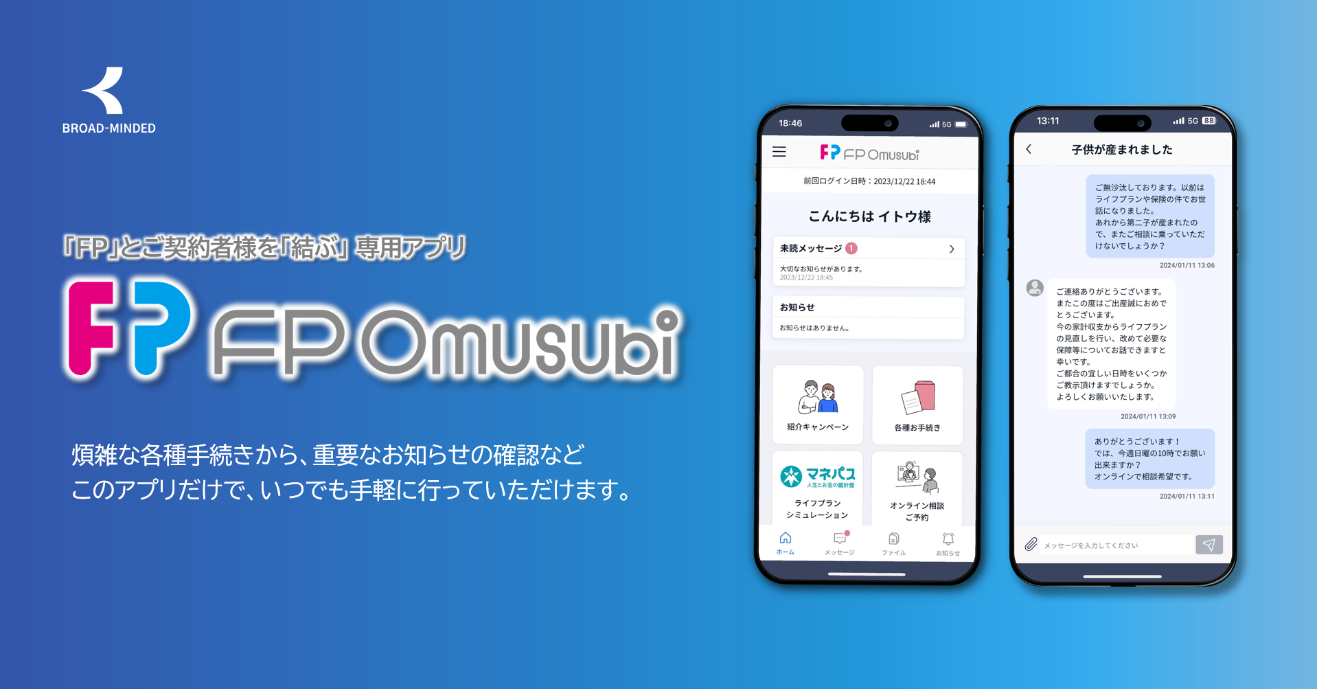 人々のライフプラン実現をサポートする金融サービス開発カンパニー ブロードマインド株式会社は、ご契約様専用アプリ『FP Omusubi(エフピーオムスビ)』の配信を開始いたしました。