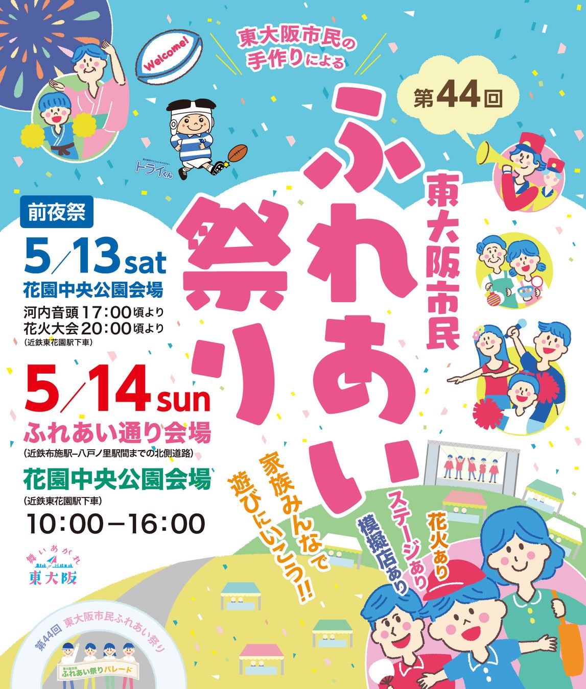 東大阪市民ふれあい祭とは、毎年5月の第2日曜日に開催される市民一人ひとりが主催者のお祭りです。布施から八戸ノ里間の道路を歩行者天国にした「ふれあい通り会場」と、花園ラグビー場に隣接する「花園中央公園会場」では、パレードあり、ステージあり、催し物が多数出展する「市民生活の祭典」ともいえるお祭りです。実行委員会メンバーは約400名、パレード、ステージ、催し参加団体を合わせると総団体数は約400団体となり、来場者数は毎年40万人を超える大規模な市民イベントです。