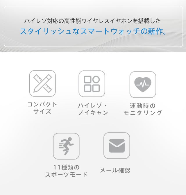 - コンパクトなのにワイヤレスイヤホンまでもを搭載したスマートウォッチ。