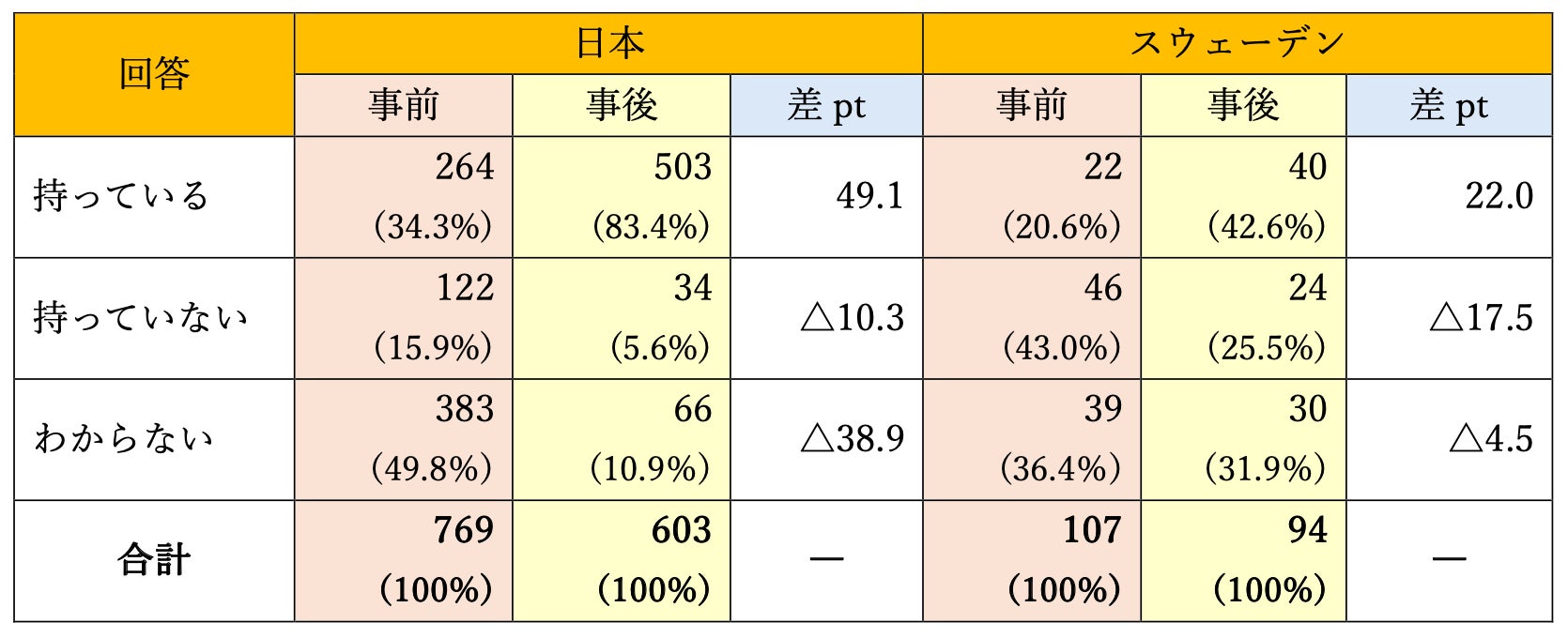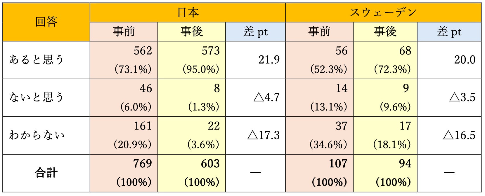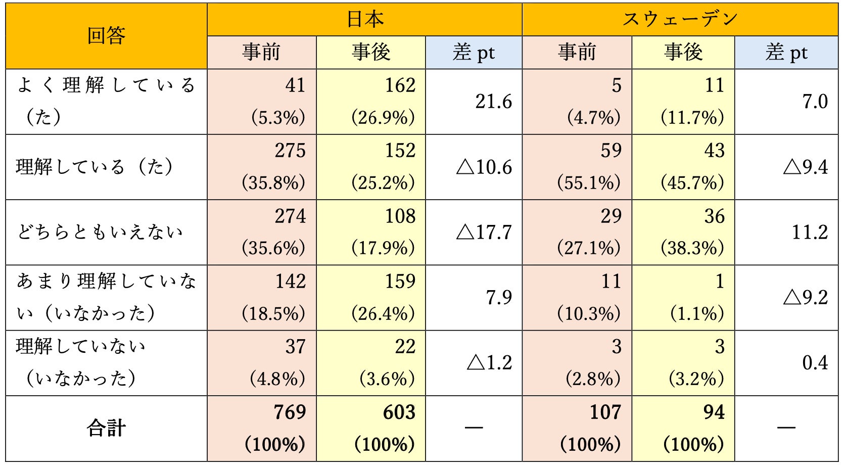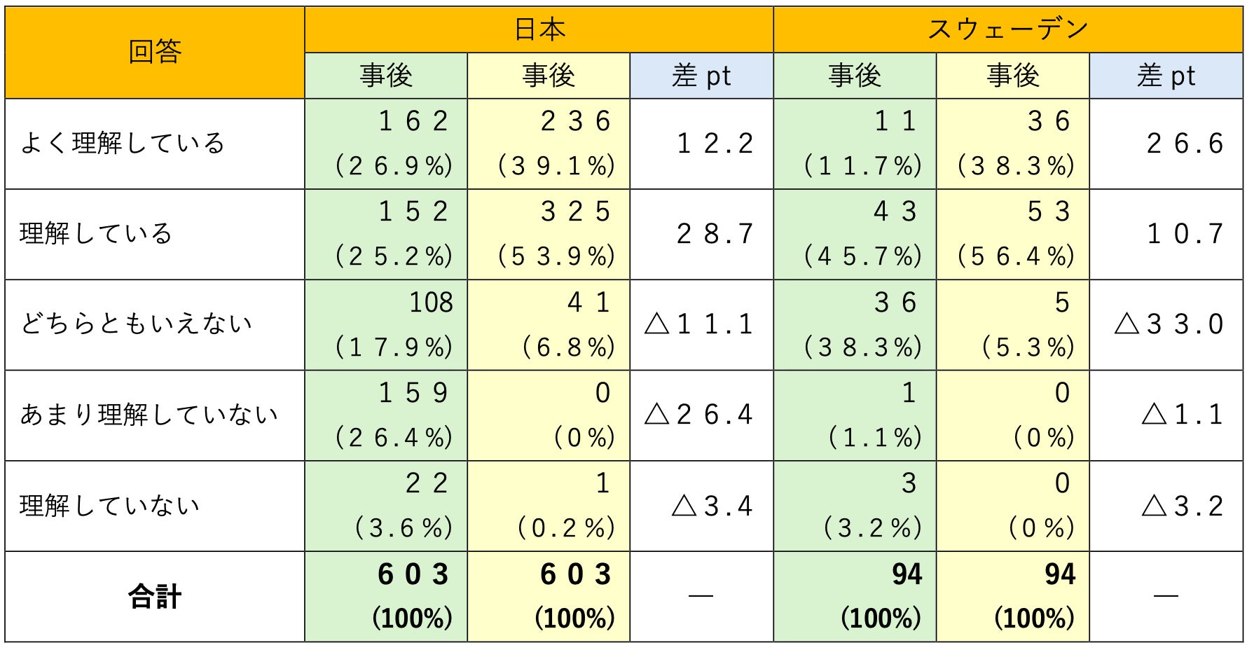 10代のデジタルエチケットプログラム実施前後で著作権に関する意識調査を行ったところ、実施前はスウェーデンの生徒の方が日本に比べて著作権を持っていないと回答した生徒の割合が多かったが、実践後は、著作権が自分に関わりがあることを認識するという結果となりました。また、両国の生徒に共通して、著作権を持っているかどうかに関わらず、著作権を身近な課題として捉える姿勢が見られました。授業の前後で理解度を比較したところ、いずれのケースでも理解が深まったことが確認され、本プログラムが著作権意識を高めるうえで大きな効果を発揮していることが明らかになりました。