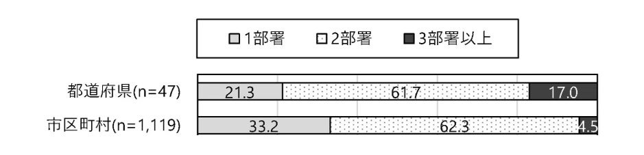 地域連携・地域移行に関わりのある部署数は、都道府県では「1部署」が21.3%、「2部署」が61.7%、「3 部署以上」が17.0%であった。市区町村は「1部署」が33.2%、「2部署」が62.3%、「3部署以上」が4.5%であった。都道府県、市区町村ともに「2部署」が最も高く6 割以上の自治体が複数の部署で地域連携・地域移行に取り組む実態が明らかとなった。「2部署」の主な組み合わせは「教育委員会の学校関連部署」と「教育委員会のスポーツ関連部署」、「教育委員会の学校関連部署」と「首長部局のスポーツ関連部署」の2つが多い。