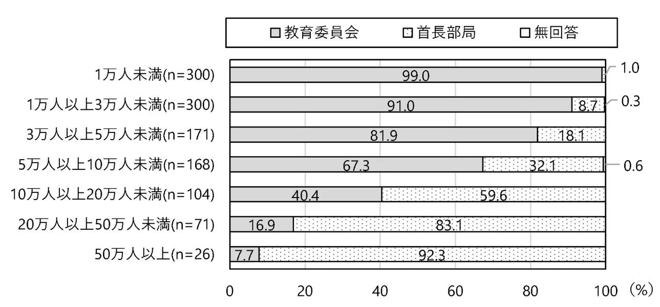 市区町村では「教育委員会」が2015年調査より7.2 ポイント減少、「首長部局」が7.5ポイント増加した。市区町村の人口規模別にみると、「1万人未満」では「教育委員会」が99.0%と、ほぼすべての自治体で教育委員会がスポーツ行政を担っている現状が明らかになった。「50万人以上」の自治体では「首長部局」が92.3%であった。